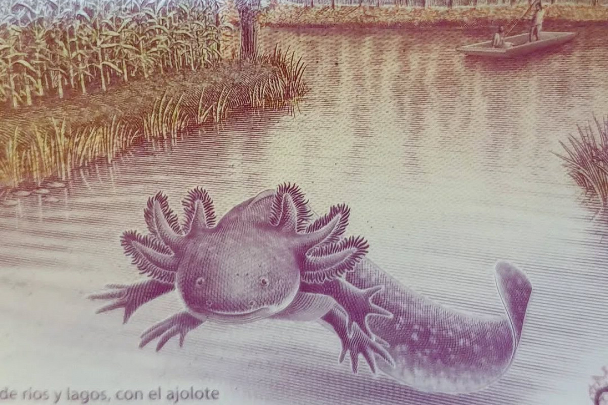 Эти существа обитали в озере Тескоко еще до возникновения империи ацтеков, которые построили свою столицу Теночтитлан на острове посреди этого озера. Именно эта историческая сцена изображена на оборотной стороне банкноты.