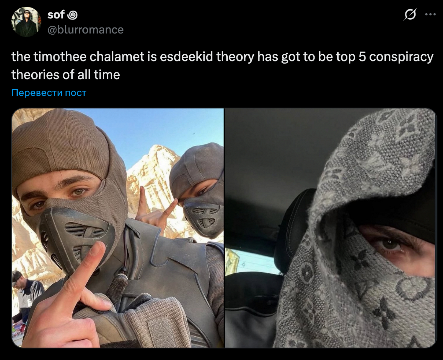 - Сходство глаз рэпера в маске и звезды «Дюны».