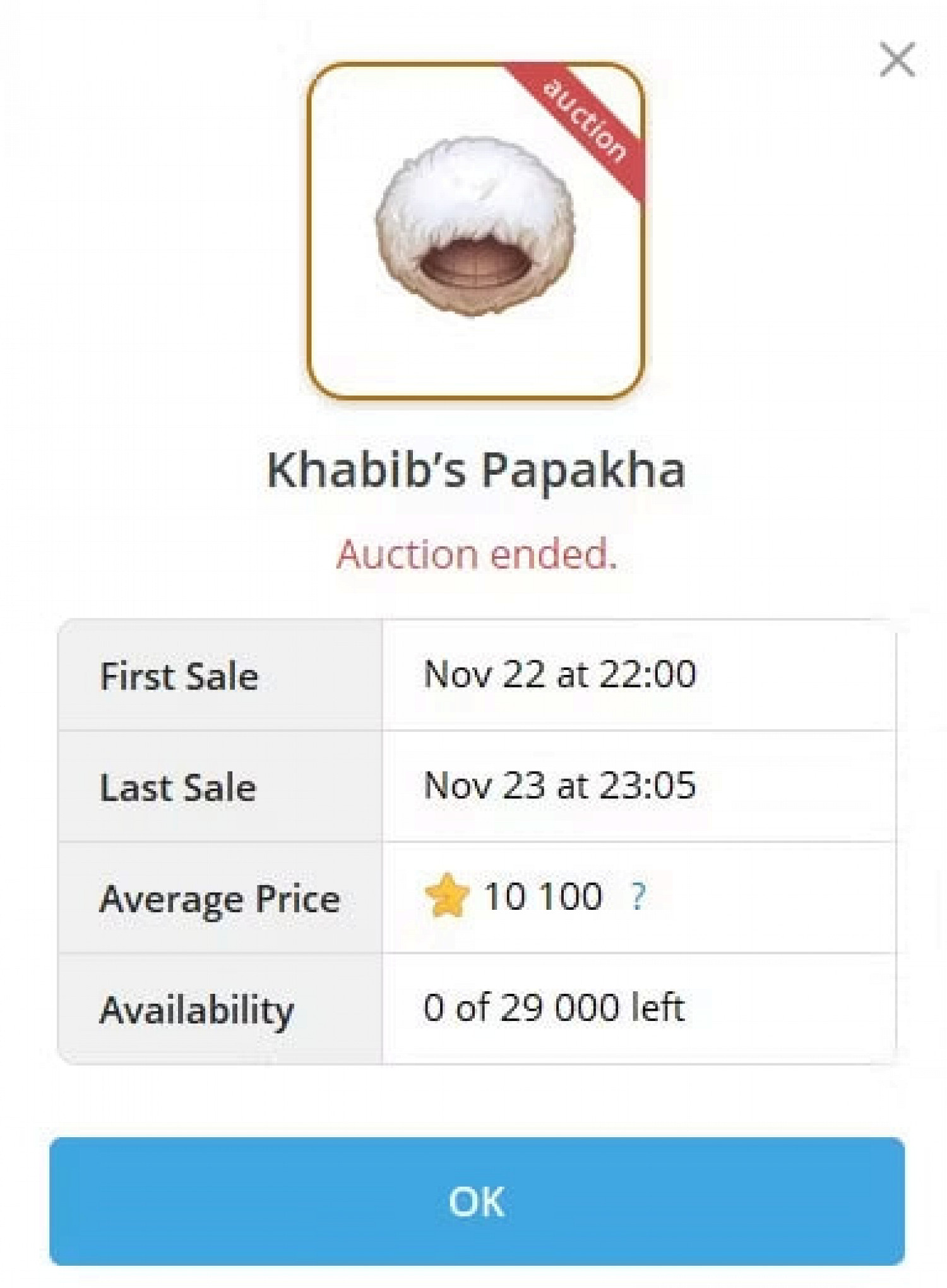 Telegram заработал 347,194 млн рублей на аукционе виртуальных папах экс-чемпиона UFC Хабиба Нурмагомедова. Об этом сообщает ТАСС.