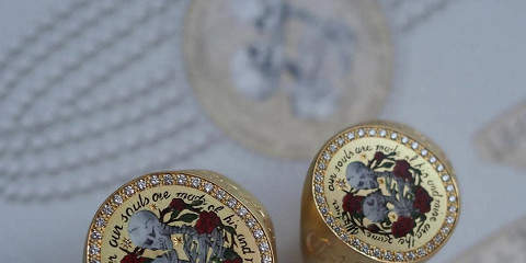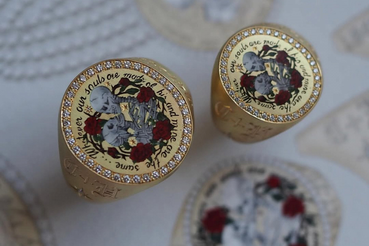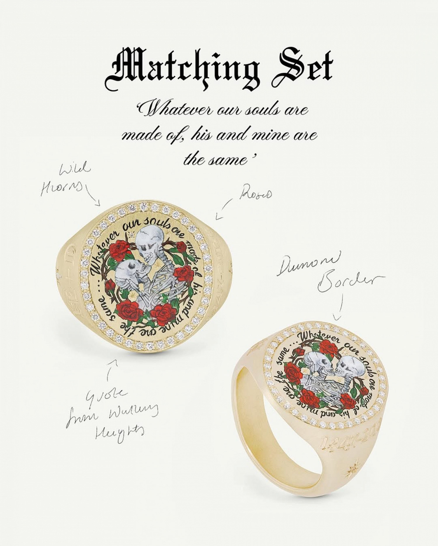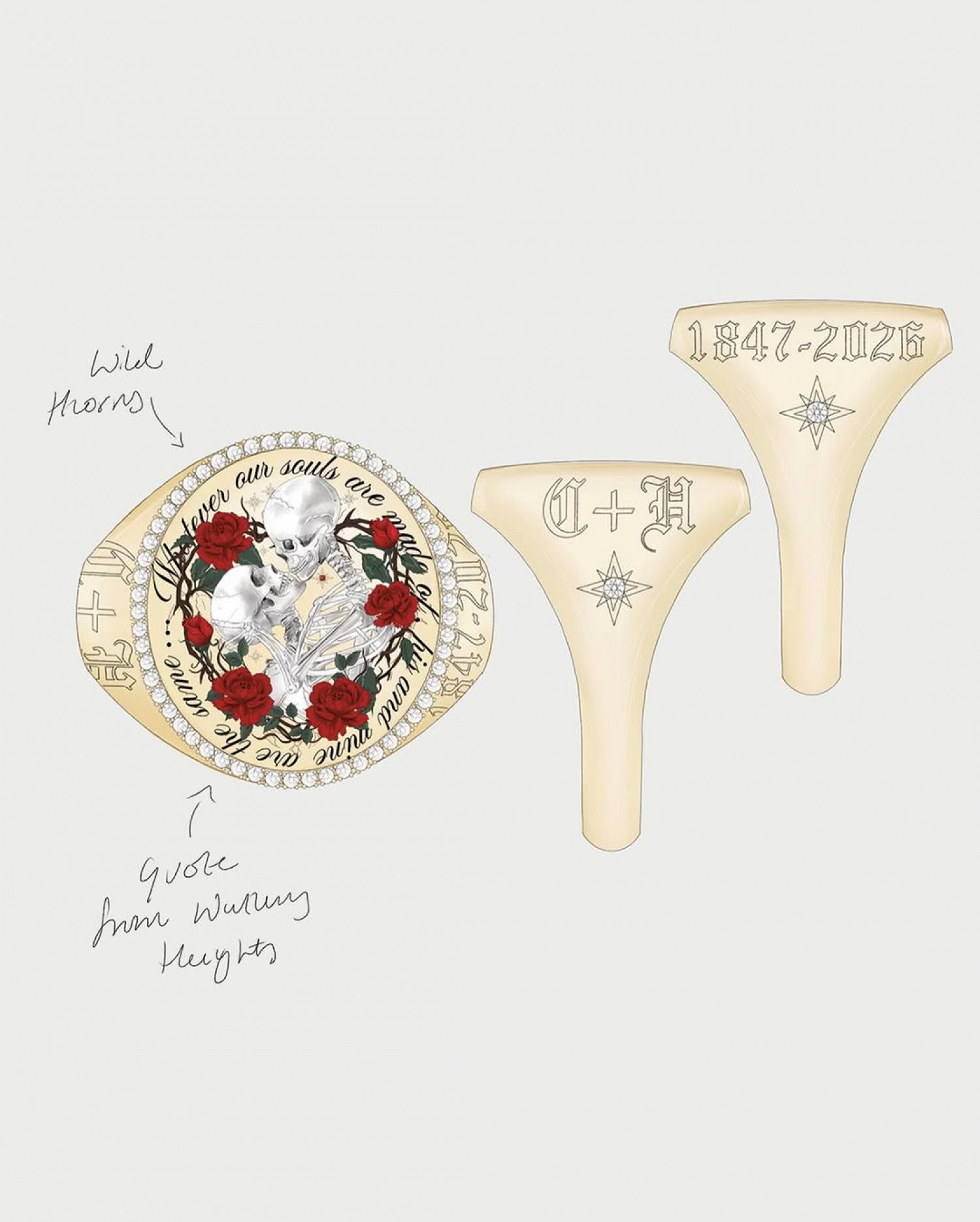 На массивных круглых кольцах-печатках изображены два черепа в окружении цветов и шипов. Сбоку на корпусе написаны инициалы Кэти и Хитклиффа — главных героев «Грозового перевала» — и даты «1847–2026», отсылающие к году выхода романа Бронте и экранизации Эмералд Феннел.