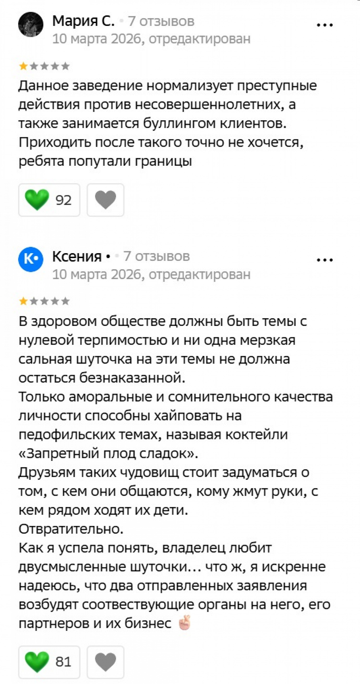 В одном из отзывов жительница Краснодара утверждает, что ее в заведении назвали «бобрихой». «Возможно, мне послышалось…» — написала с надеждой она. Кроме того, женщины пожаловались на реакцию на критику.