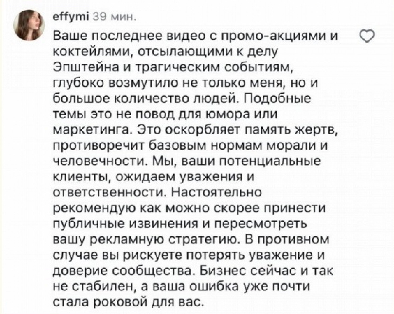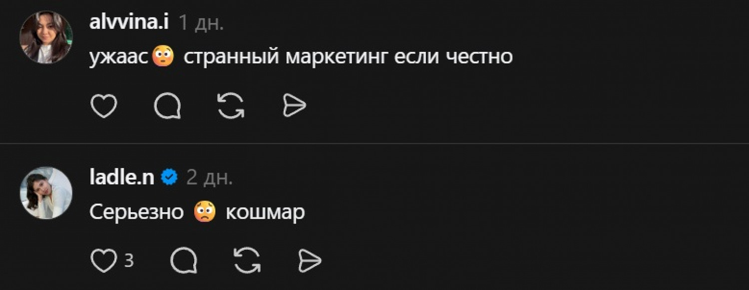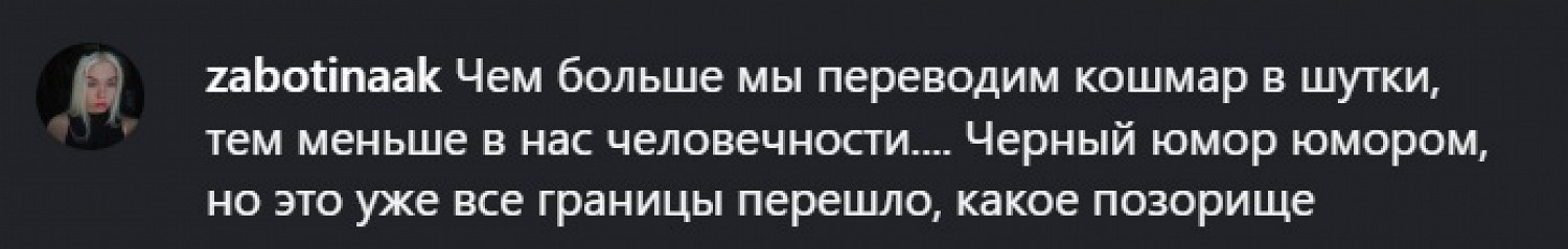«Это оскорбляет память жертв, противоречит базовым нормам морали и человечности. Мы, ваши потенциальные клиенты, ожидаем уважения и ответственности», — написала одна девушка. Другие комментаторы были еще более жесткими в оценке рилса.
