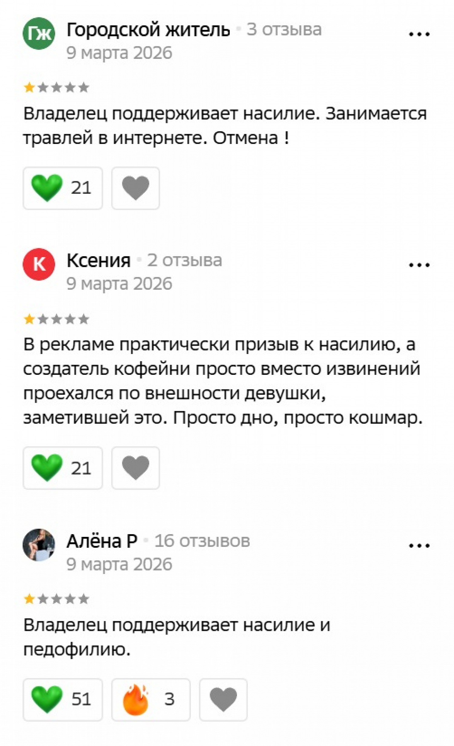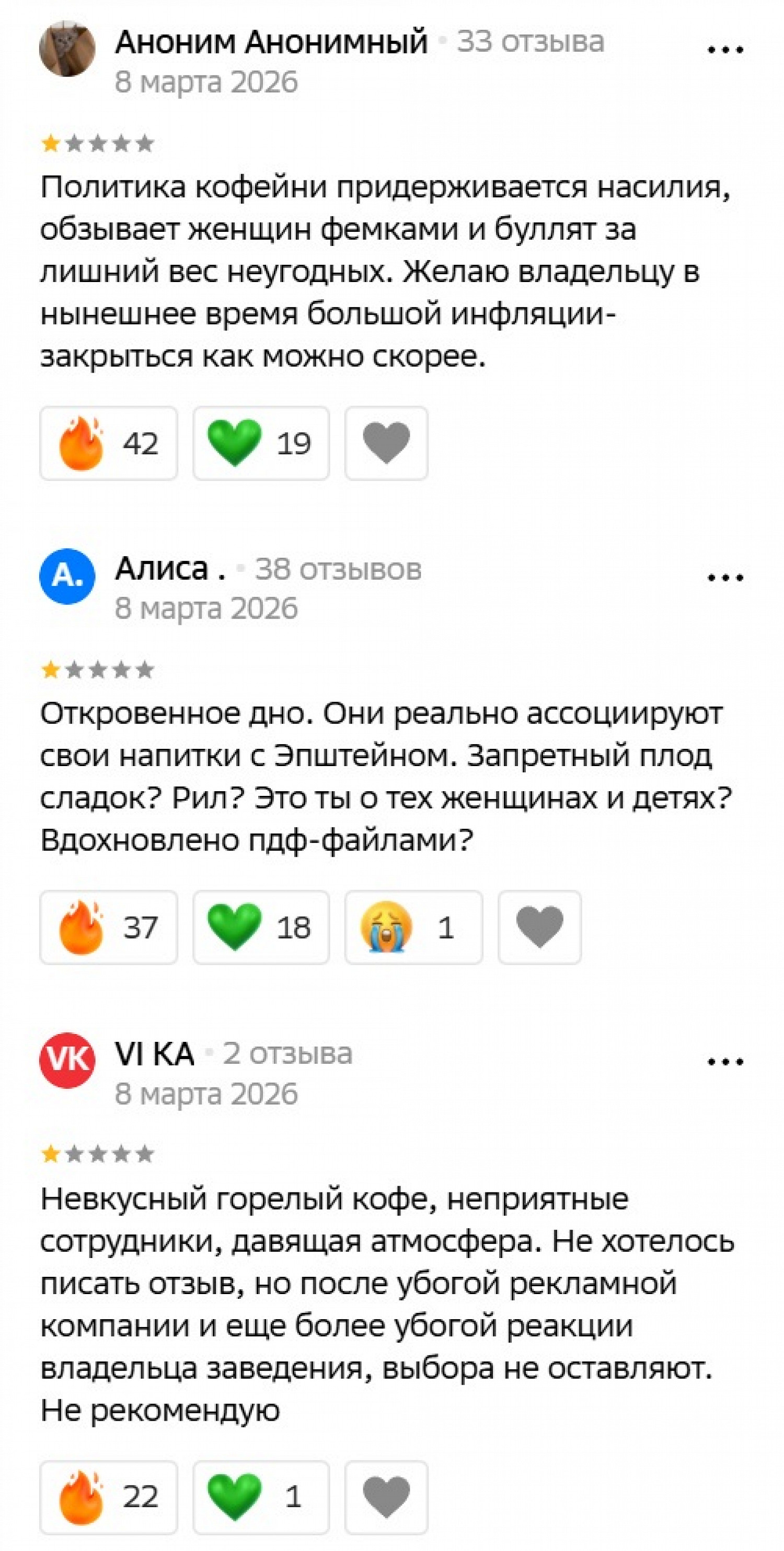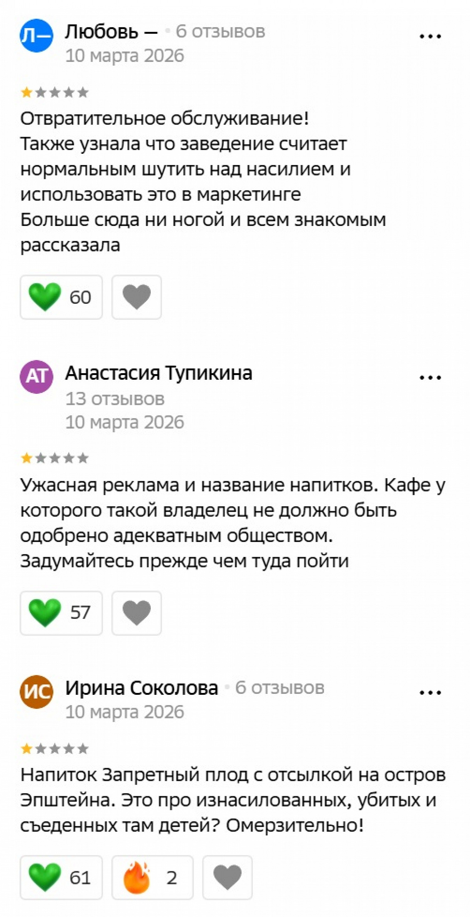 Критике подвергся не только сомнительный маркетинг, но и отношение персонала к женщинам. По словам клиенток, владелец кафе Гор Мартиросян оскорбляет девушек и в комментариях, и даже при обслуживании.