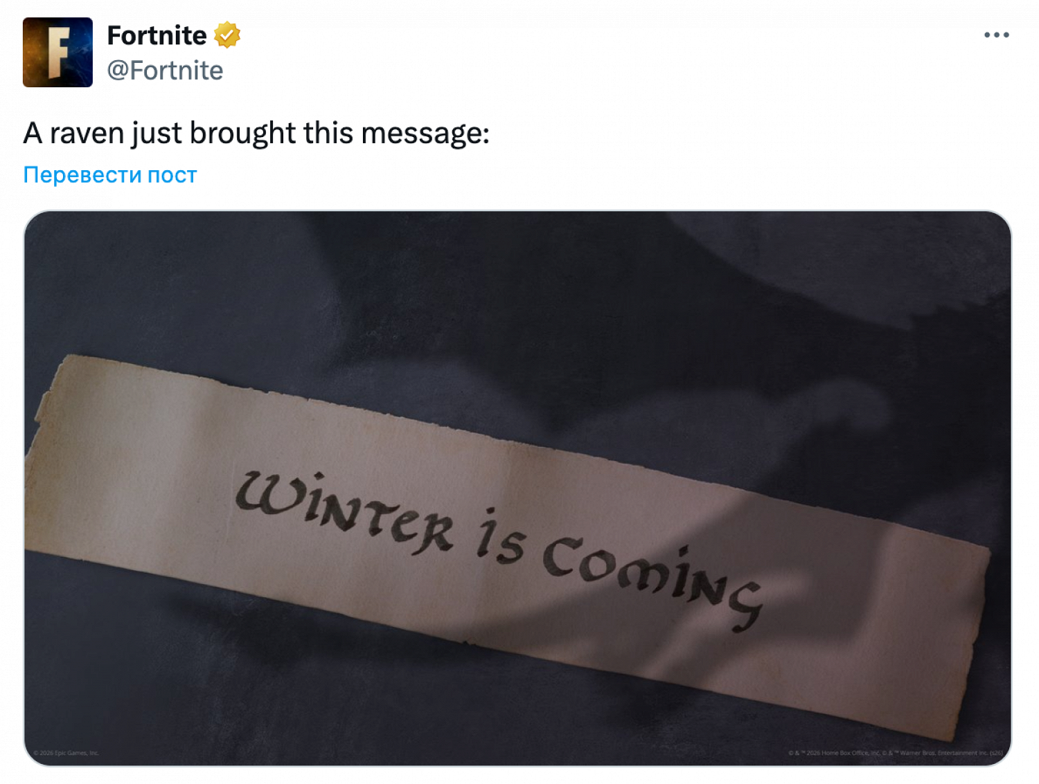 Официальный аккаунт игры опубликовал изображение свитка с надписью «Зима близко» — знаменитой фразой из саги Джорджа Мартина. Событие приурочено к 15-летию премьеры сериала.