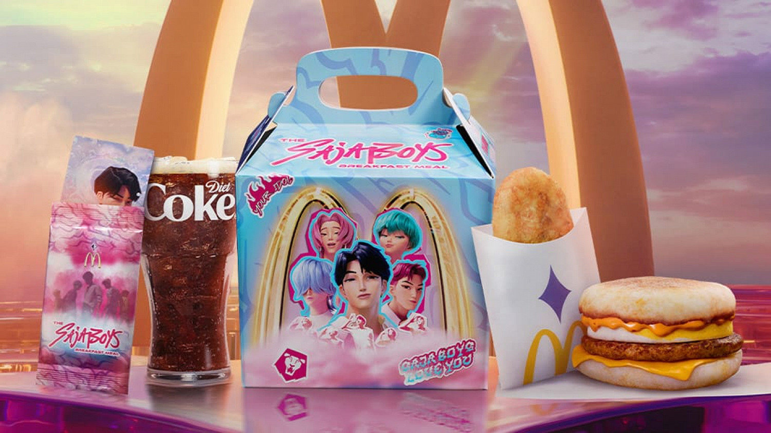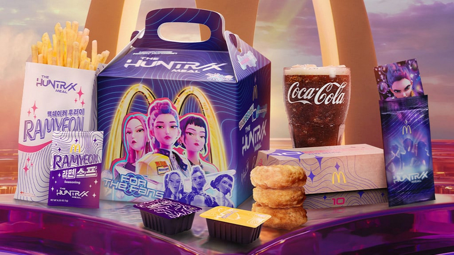 Сеть подготовила два комбонабора. Один посвящен девушкам из группы Huntr/x, другой — парням-демонам из Saja Boys. В первом: 10 куриных наггетсов, картошка фри с приправой со вкусом рамена и два новых соуса — соус охотниц и фиолетовый соус демонов. На десерт — черничный «Депри Макфлурри», названный в честь героя-тигра.