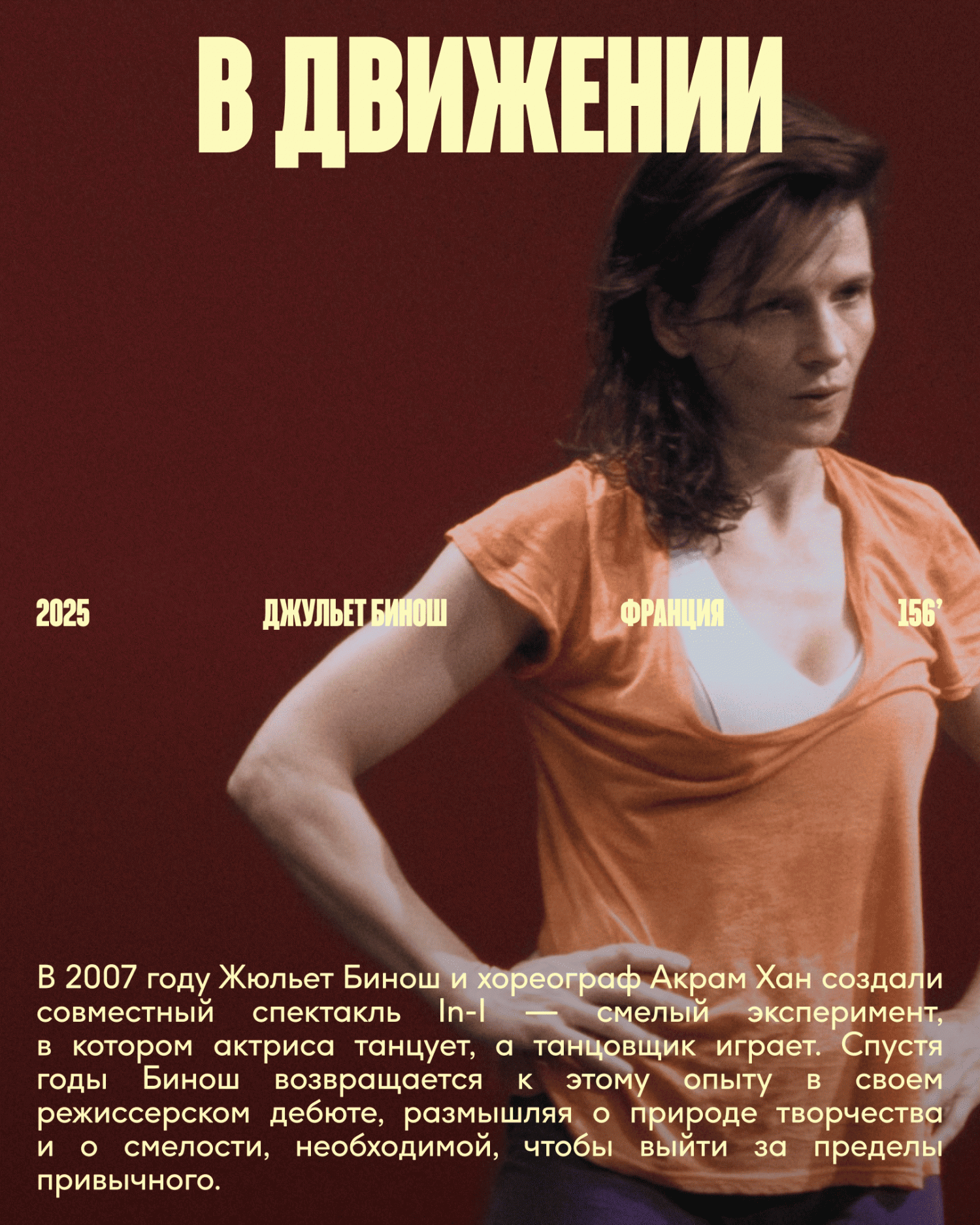Одним из главных фильмов смотра станет новая работа Вернера Херцога — «Слоны-призраки». Это хроника экспедиции в ангольскую саванну, перерастающая в философское рассуждение о человеческой одержимости. Режиссерский дебют «В движении» представит французская актриса Жюльетт Бинош. В нем покажут спектакль «In-I», поставленный Бинош вместе с хореографом Акрамом Ханом и сценографом Анишем Капуром в 2007 году.