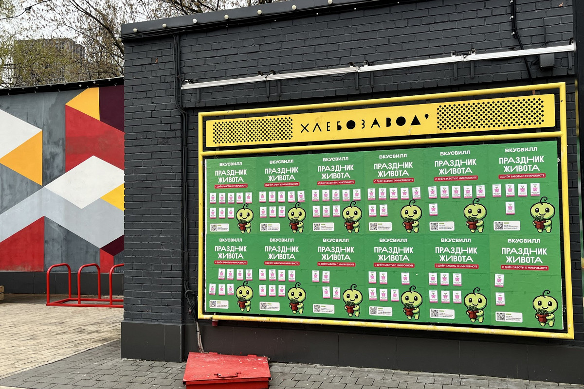 На территории «Хлебозавода» в Москве «Вкусвилл» разместил плакаты с прикрепленными пакетиками семян микрозелени, которые можно сорвать и вырастить дома.