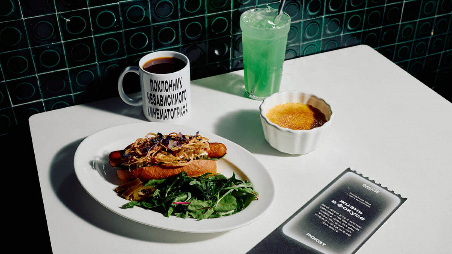 В меню вошли также блюда и напитки с отсылками к фильму «Здесь был Юра». Гостям предлагают «Панк-доги» с куриной сосиской и соусом тартар, а также напитки в домашней кружке — точь-в-точь, как у героев картины.