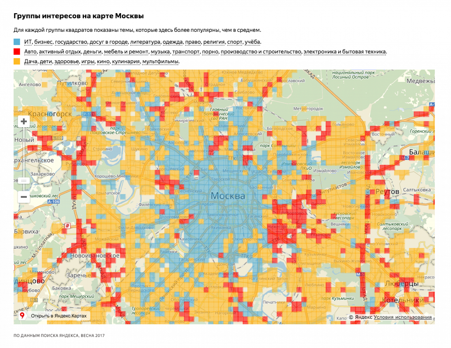 «Яндекс» выделил, что по поисковым запросам Москву можно разделить на три области. В центре (территория до Третьего транспортного кольца) чаще ищут информацию про офисную работу, образование, городские развлечения и одежду. Во второй области — промзоны и крупные магистрали — интерес выше к строительству, транспорту, банкам, автомобилям, инструментам. Компания также отмечает, что именно в этой области чаще слушают музыку и смотрят порно. К третьей области относятся спальные районы, в которых большинство запросов связаны с кино, играми и другими развлечениями, связанными с компьютером.