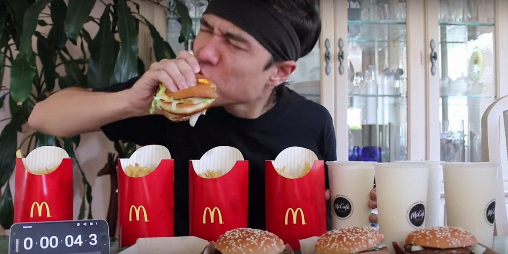Американский ютьюб-блогер Мэтт Стоуни, занимающийся скоростным поеданием еды, принял участие в Big Mac Challenge. Цель челленджа — как можно быстрее съесть четыре бигмака, четыре больших картошки фри и выпить четыре молочных коктейля.
