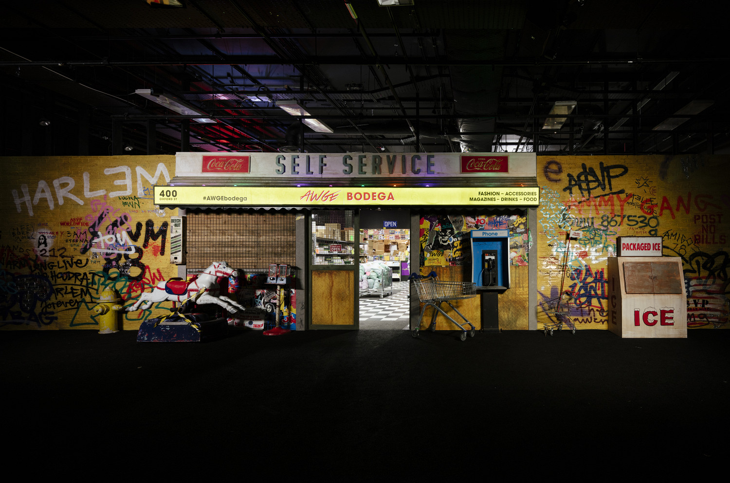 Пространство AWGE Bodega задумано с целью перенести атмосферу небольших продуктовых лавок у дома, которые повсеместно расположены в Нью-Йорке, где родился и вырос Роки. Витрину магазина разрисовали граффити, а у входа установили винтажный морозильник, разбитую телефонную будку и даже аттракцион в виде качающейся лошадки.