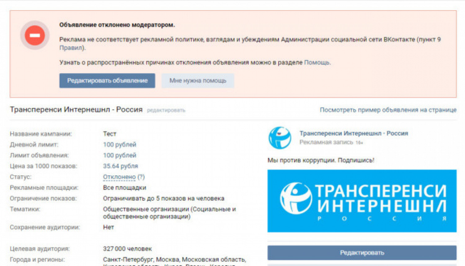 Модераторы социальной сети дважды отклоняли рекламное объявление «Трансперенси Интернешнл — Россия», заявив, что оно не соответствует «рекламной политике, взглядам и убеждениям администрации социальной сети «ВКонтакте» (пункт 9 правил)».