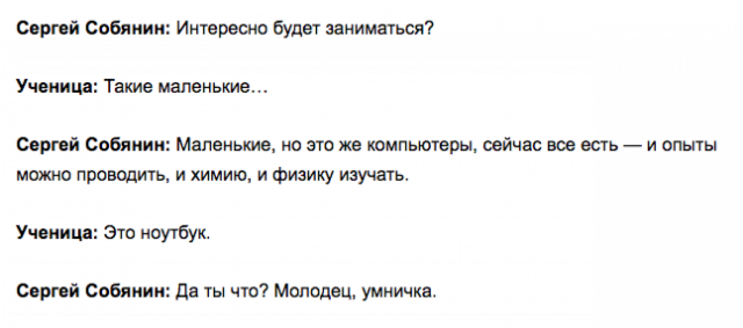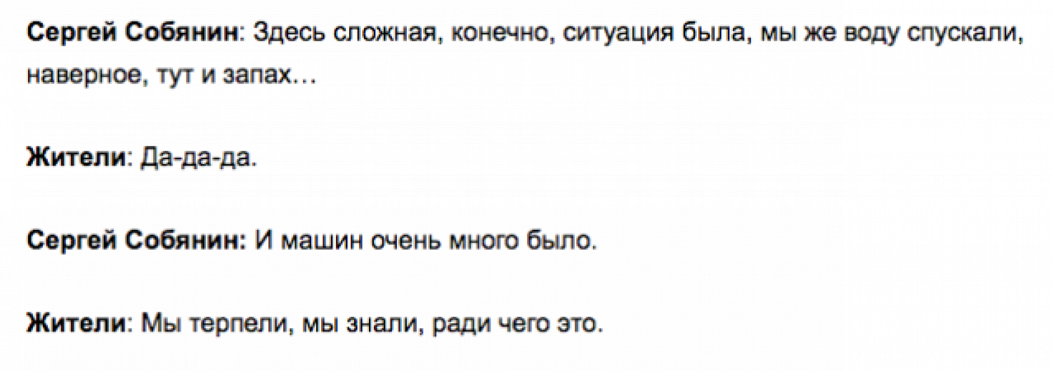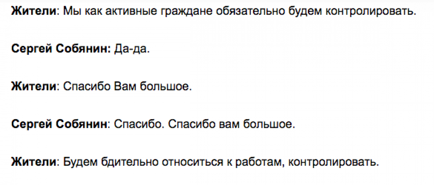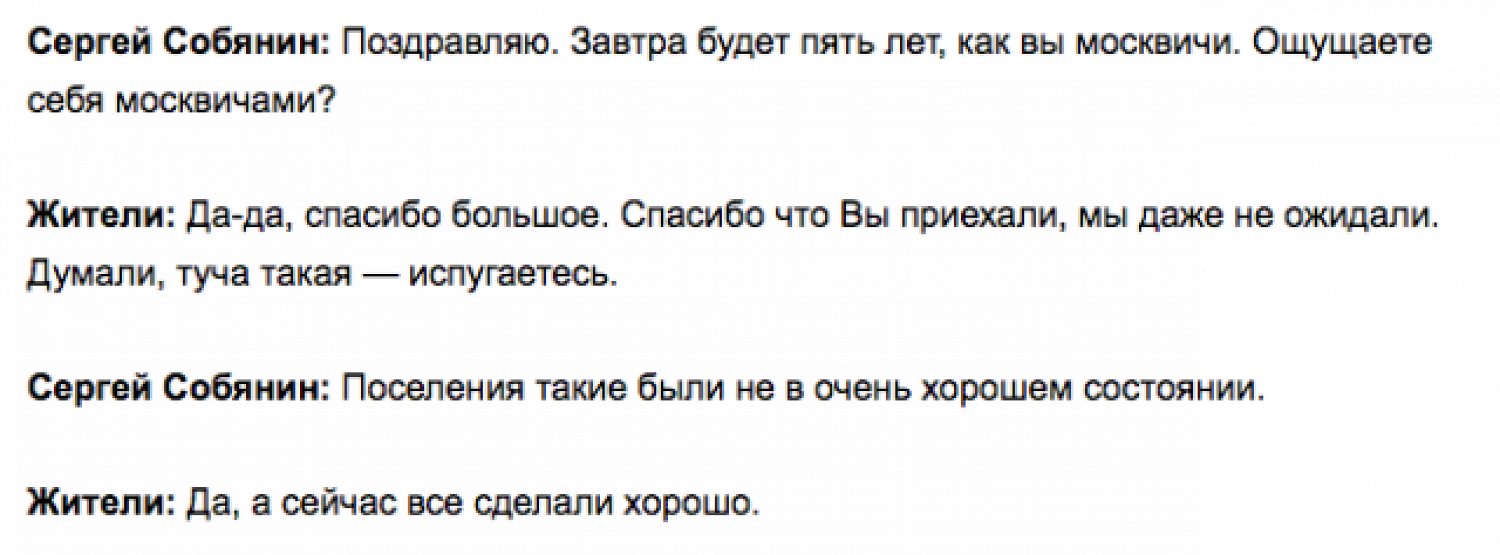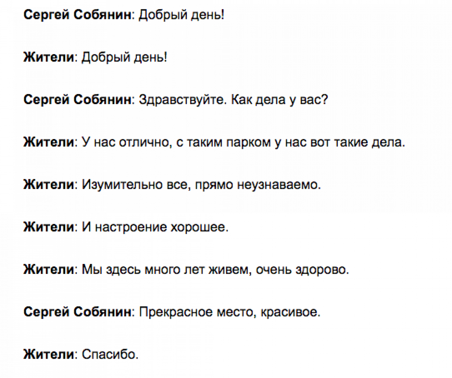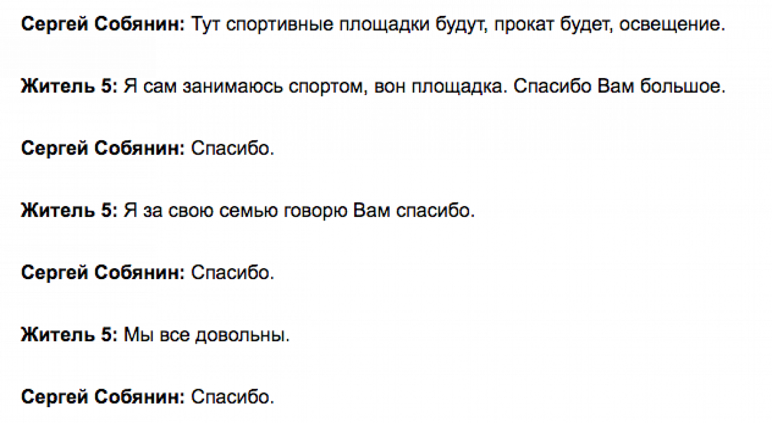 На сайте мэрии Москвы регулярно публикуются стенограммы с различных мероприятий, в которых принимает участие Сергей Собянин. Зачастую они представляют собой заранее написанные тексты мэра, но иногда в этом разделе появляются и записи разговоров с местными жителями. Эти стенограммы выглядят очень странно и больше похожи на разговор с «Алисой» из «Яндекса». Лучшие из них отобрал TJournal.