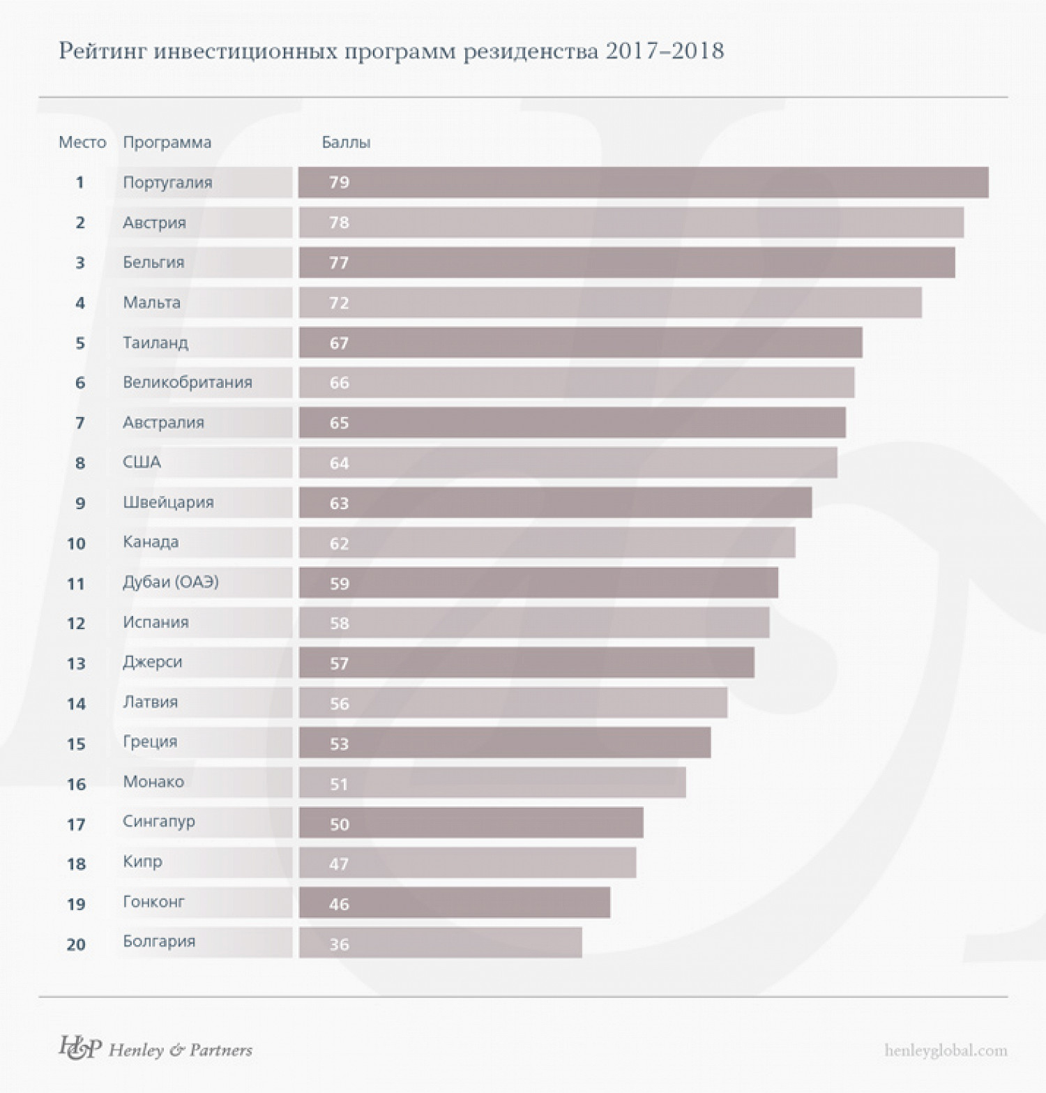 Австрия расположилась вслед за Португалией, а Бельгия замкнула топ-3 рейтинга. По сравнению с прошлогодними результатами страны поменялись местами, а Мальта осталась на четвертой строке. Впервые в рейтинге Henley & Partners появилась инвестиционная программа Таиланда, которая сразу же заняла пятое место.