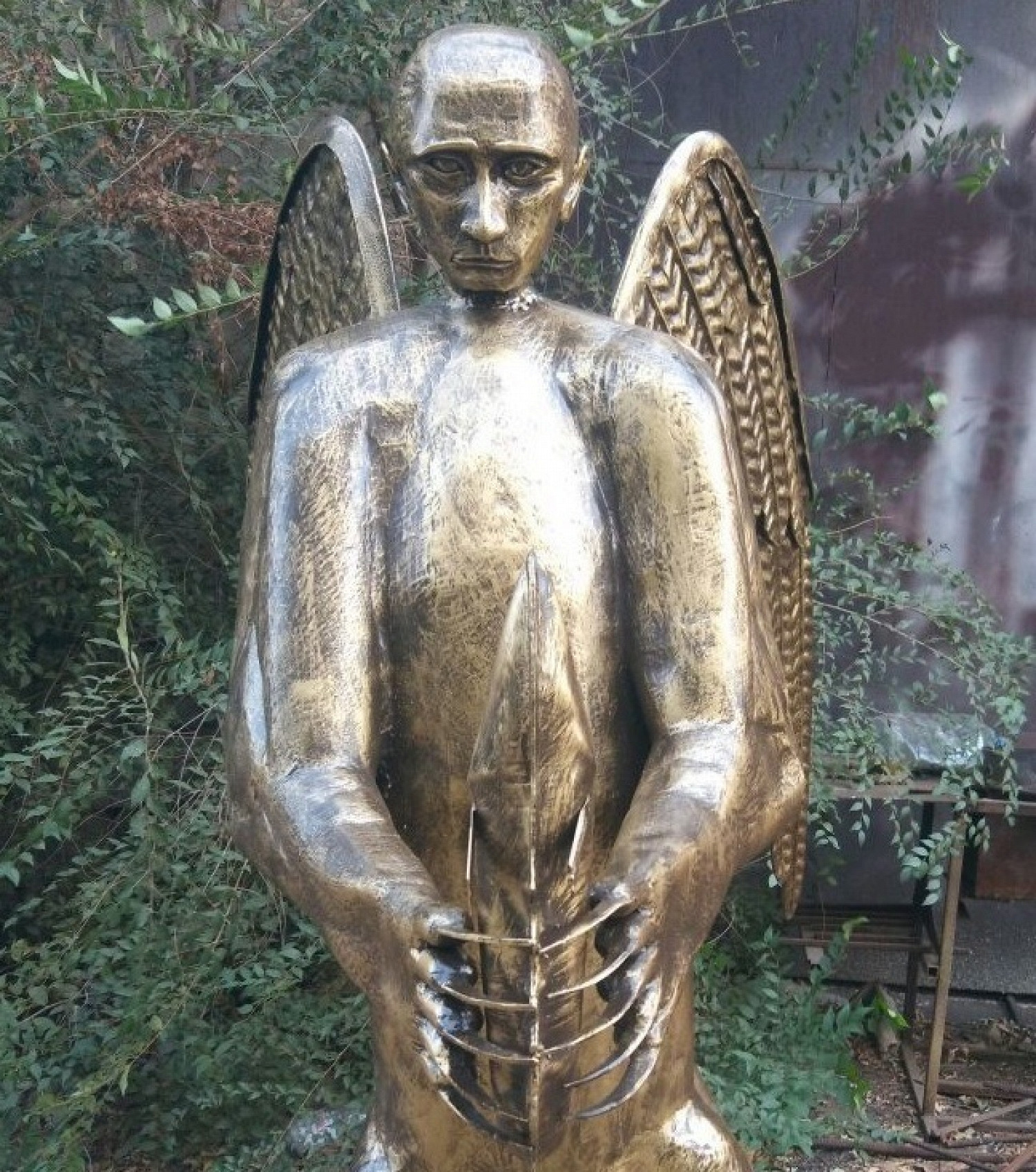 Житель Астрахани Виктор Кропачев сделал кованую скульптуру «Ум, сила и душа» в честь Владимира Путина. На ней изображен российский президент с телом медведя и орлиными крыльями за спиной, который держит в руках осетра.