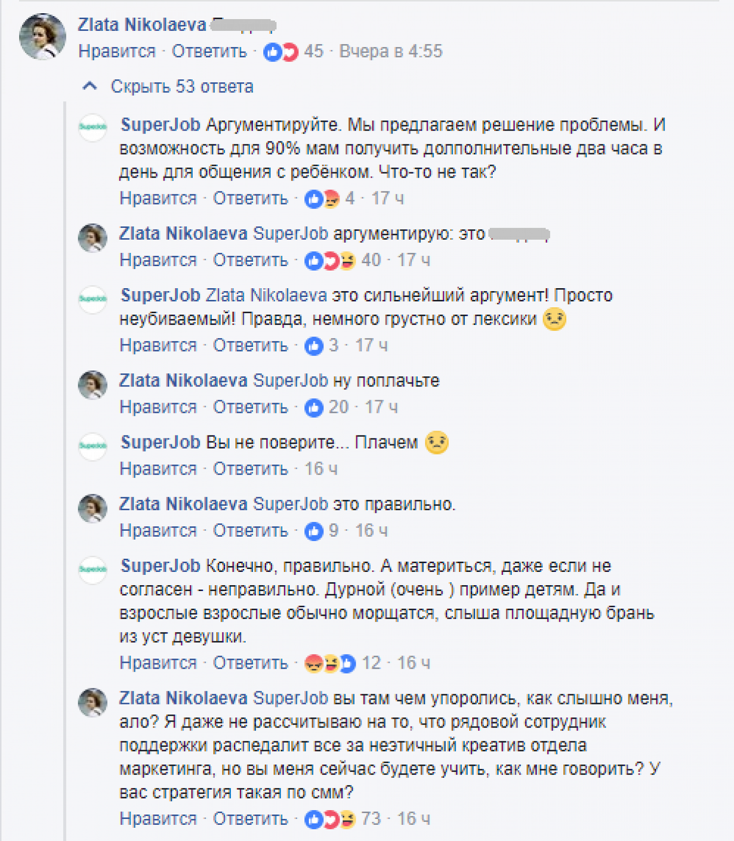 В комментарии к посту Форманюк пришли многие пользователи, согласные с ее точкой зрения, а также SMM-специалисты Superjob, которые отчитали комментаторов за использование ненормативной лексики.