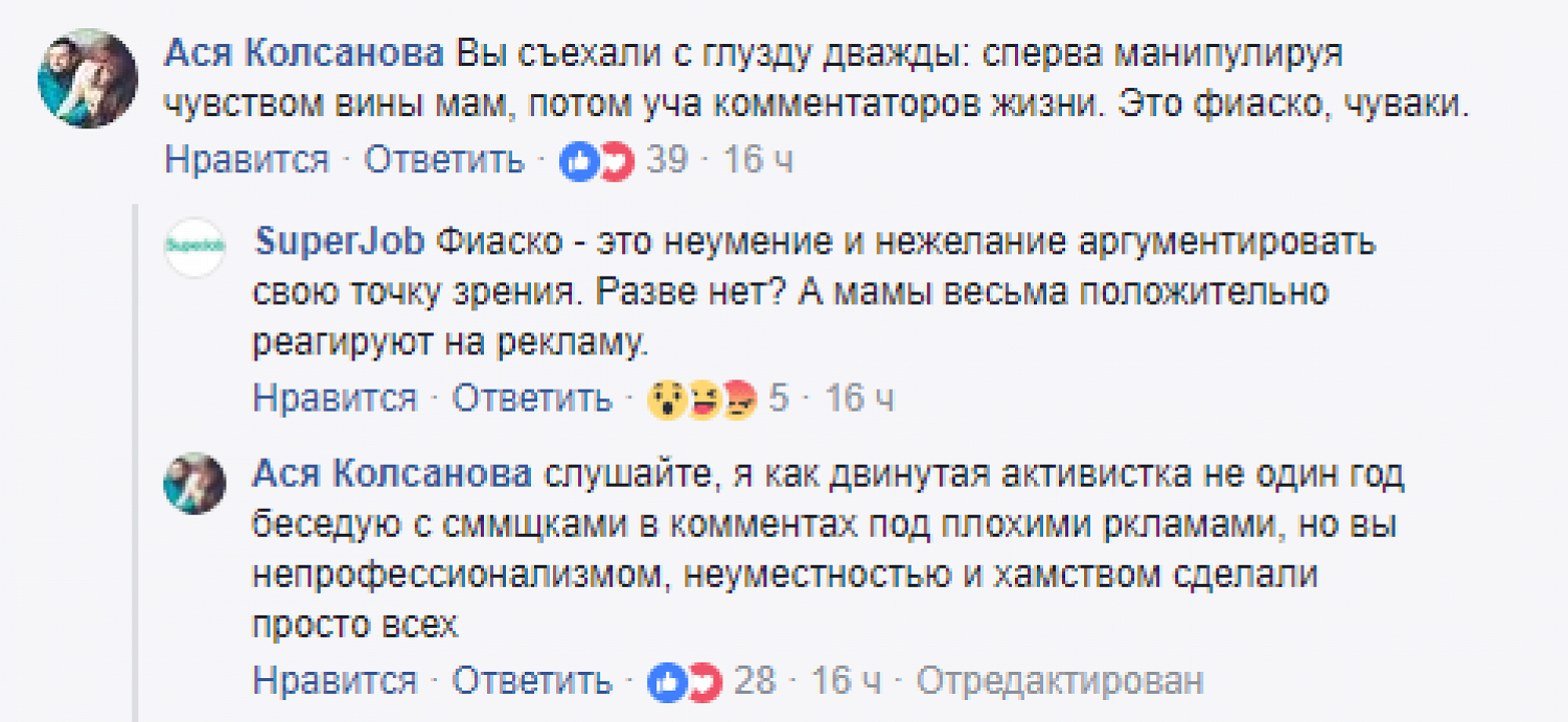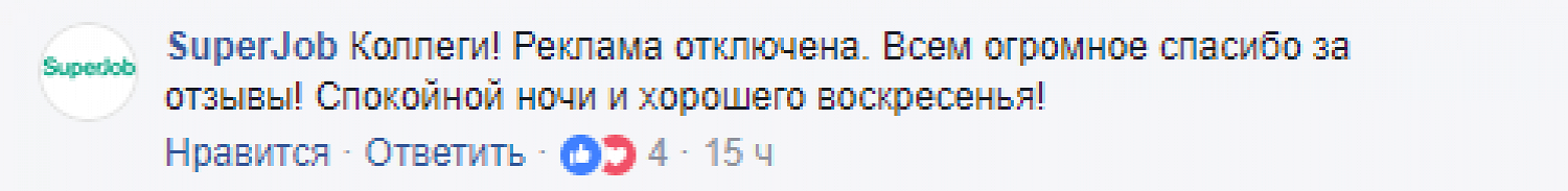 В ходе дискуссии пользователи все-таки убедили специалистов Superjob в том, что их реклама манипулирует чувством вины и негативно сказывается на имидже сервиса.