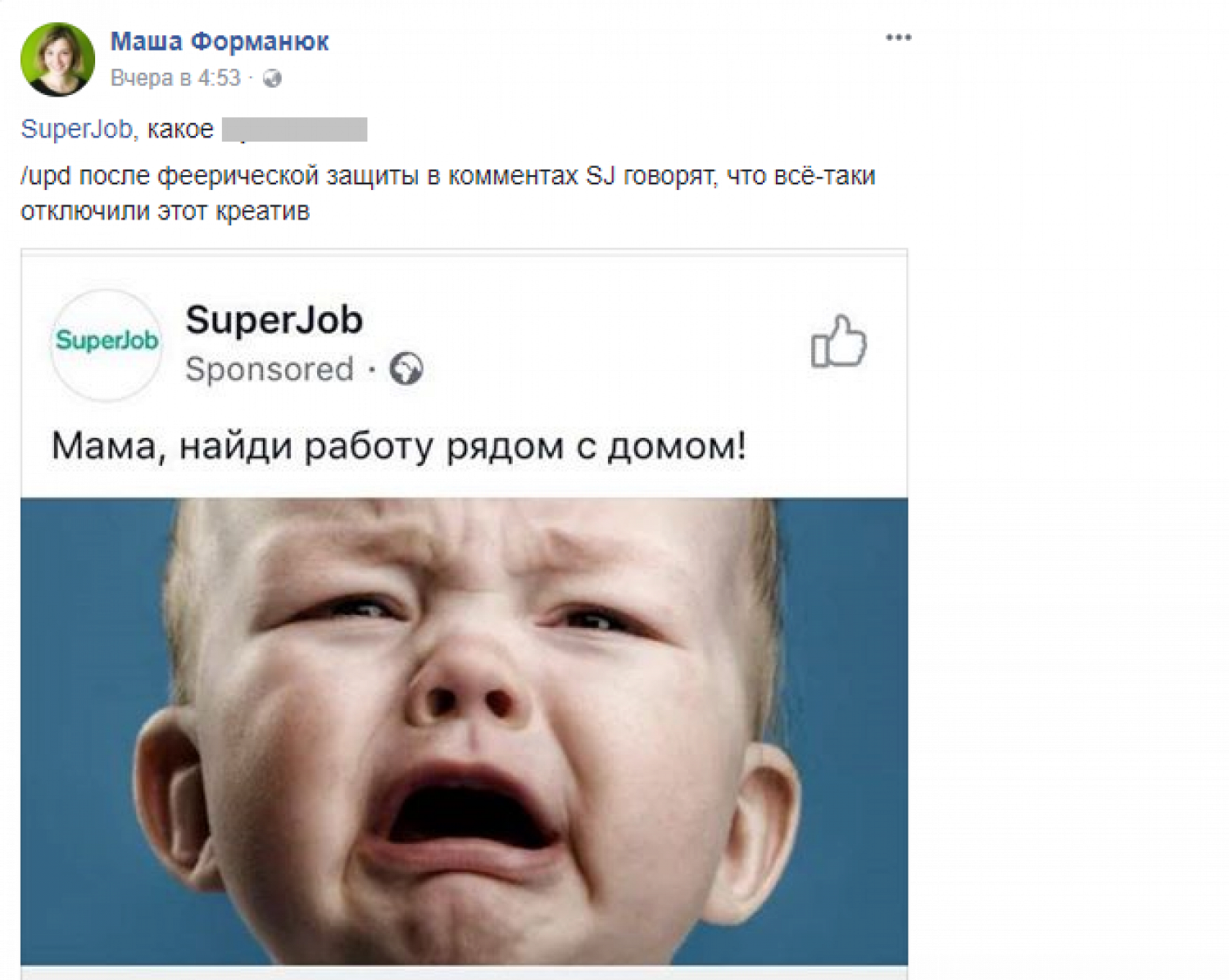 Сервис по поиску работы и подбору сотрудников Superjob опубликовал рекламу с текстом «Мама, найди работу рядом с домом!» и картинкой с плачущим ребенком. Пользователи соцсетей обвинили сервис в манипулировании чувством вины родителей.