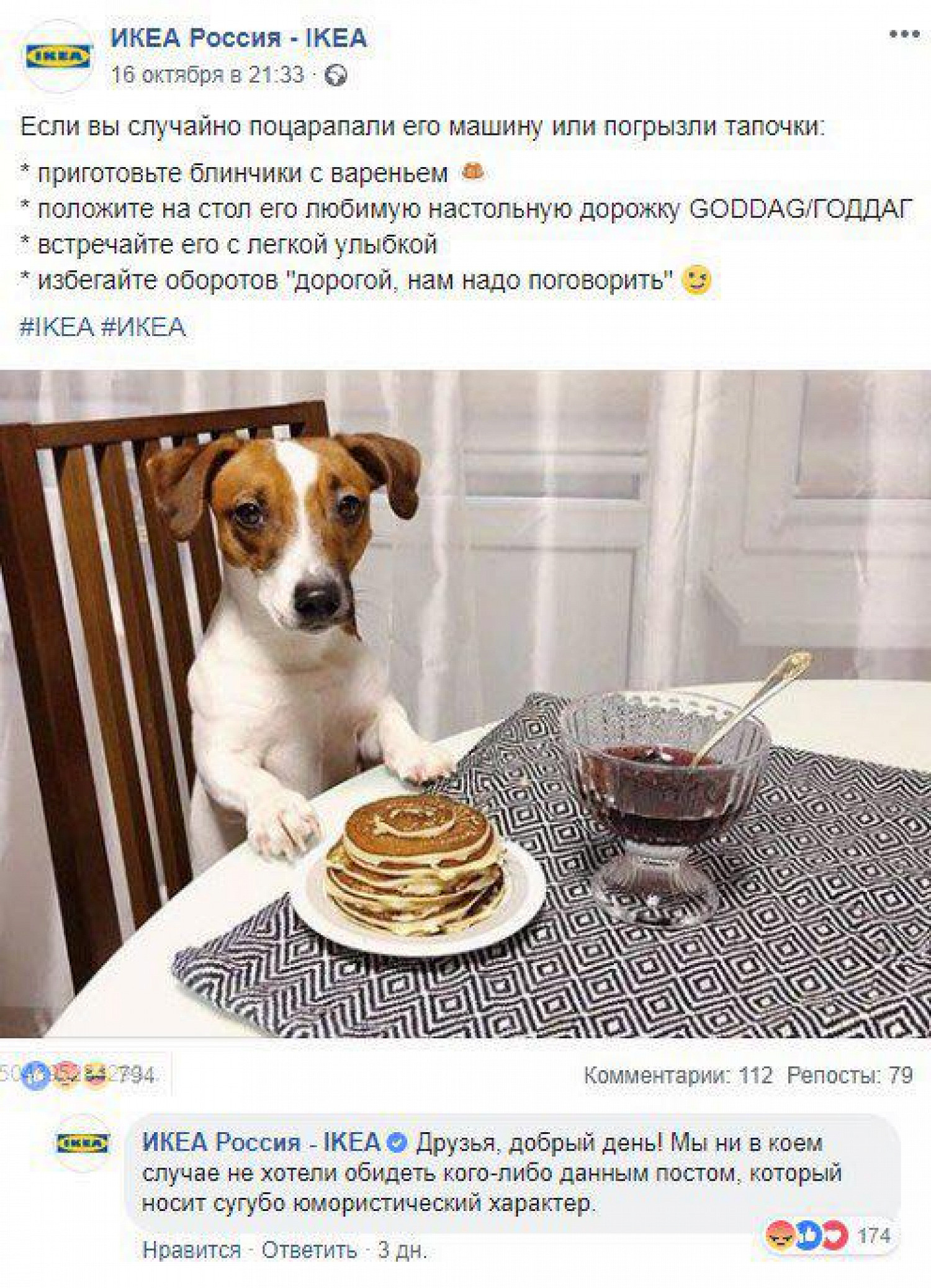 Пользователи фейсбука обвинили российское отделение IKEA в сексизме за шуточный пост с фотографией собаки и рекомендацией о том, что делать, если вы «случайно поцарапали его машину или погрызли тапочки».