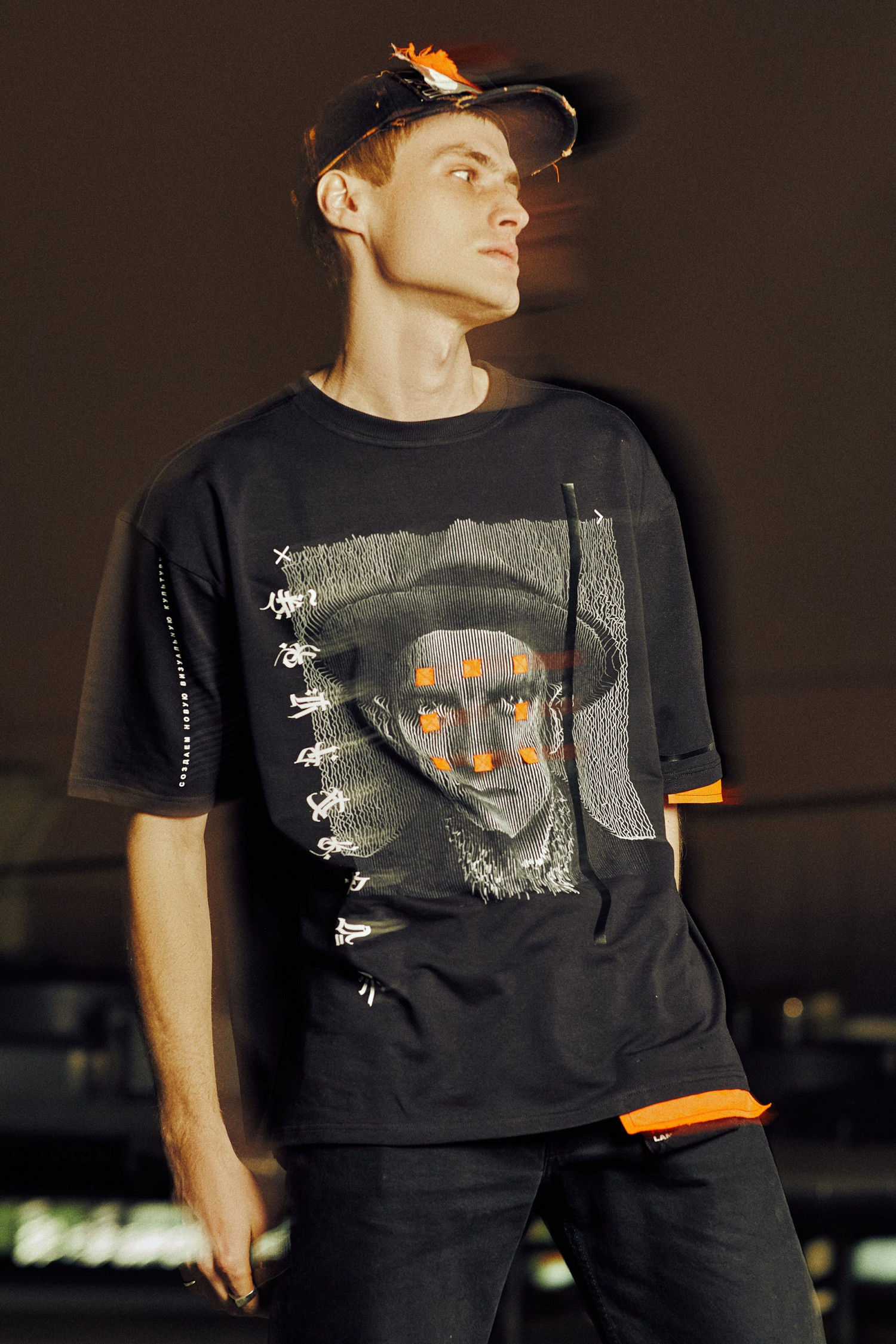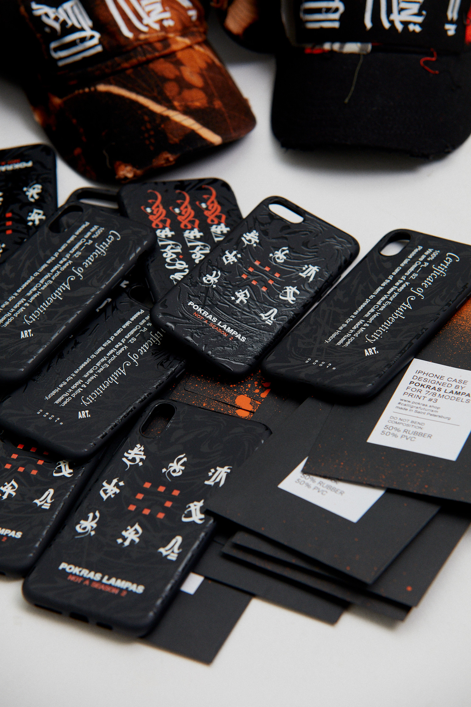 В капсульную коллекцию вошли плащи, худи, футболки, кепки и чехлы для телефонов. Лампас отметил, что ткань для одежды была создана в рамках перформанса, который состоялся на втором этаже ДЛТ 13 февраля — тогда художник расписал полотно из футера и денима площадью 30 квадратных метров.