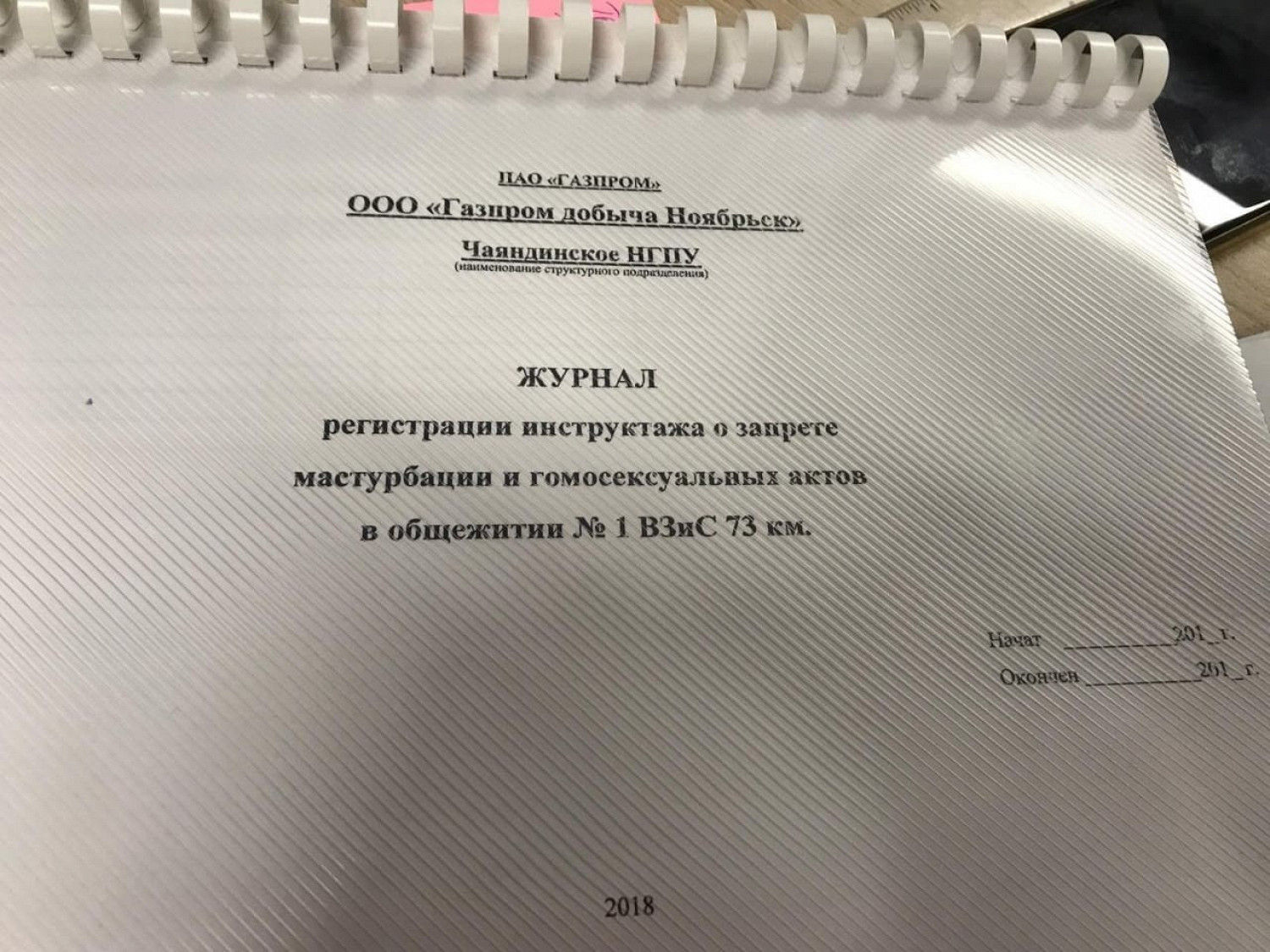 В группах в «ВКонтакте» «Типичный Ноябрьск» и «Злой ноябрянин» опубликовали фото журнала «регистрации инструктажа о запрете мастурбации и гомосексуальных актов» в общежитии. Судя по фото, он предназначен для работников компании «Газпром добыча Ноябрьск».