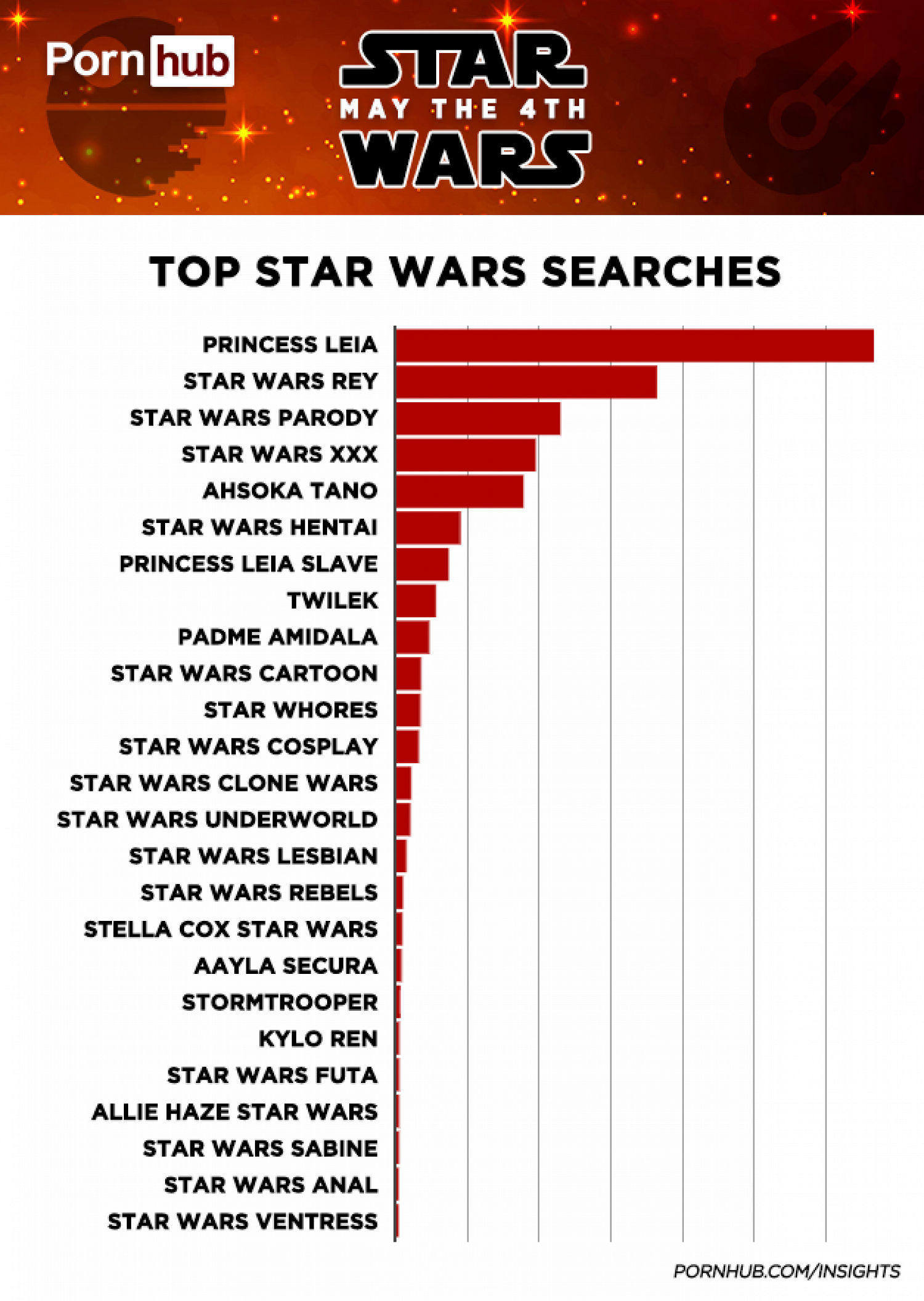 Ко Дню «Звездных войн», который поклонники саги традиционно отмечают 4 мая, Pornhub опубликовал исследование, посвященное поисковым запросам, связанным с франшизой.