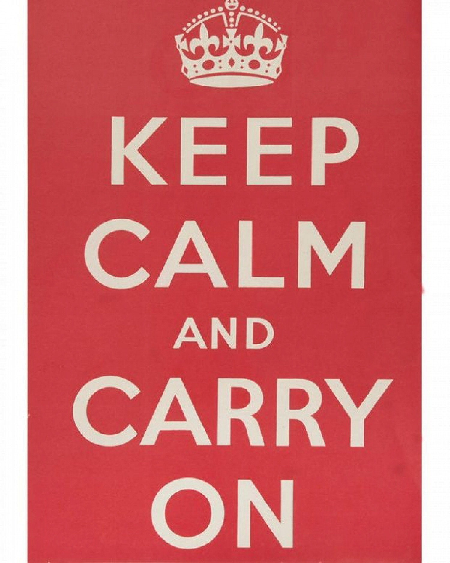 Агитационный плакат был выпущен Министерством информации Великобритании в 1939 году — таким образом власти надеялись успокоить британцев в начале Второй мировой войны. Надпись венчает корона, что свидетельствует о том, что послание адресовано британским подданным от короля Георга VI. Постер не получил широкого распространения и был бы окончательно забыт, если бы два десятка его копий в 2000 году не обнаружились в магазине подержанных книг Barter Books. В 2000-х фраза «Keep calm and carry on» внезапно обрела популярность и породила множество пародий.