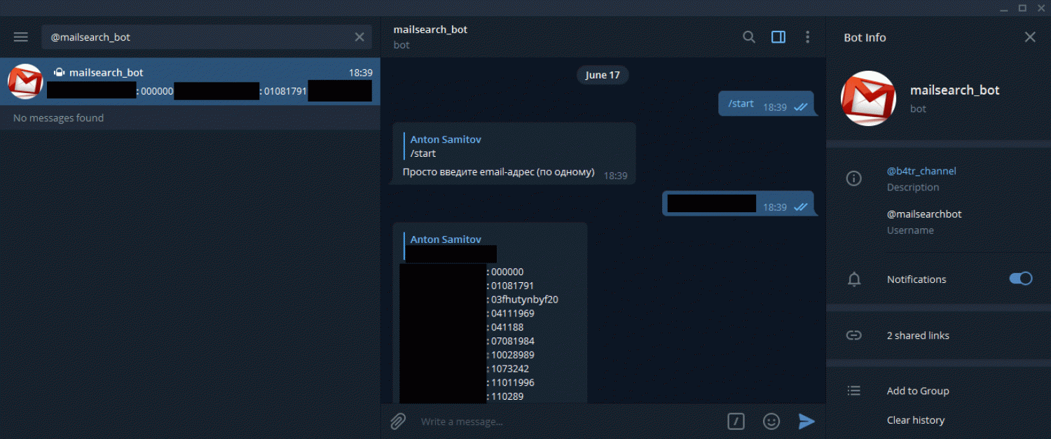 Боту нужно прислать адрес электронной почты и в ответ он присылает до сорока связанных с ним паролей. MailSearchBot выдает данные из разных сервисов, в том числе «Яндекса», Mail.ru, Gmail и других.