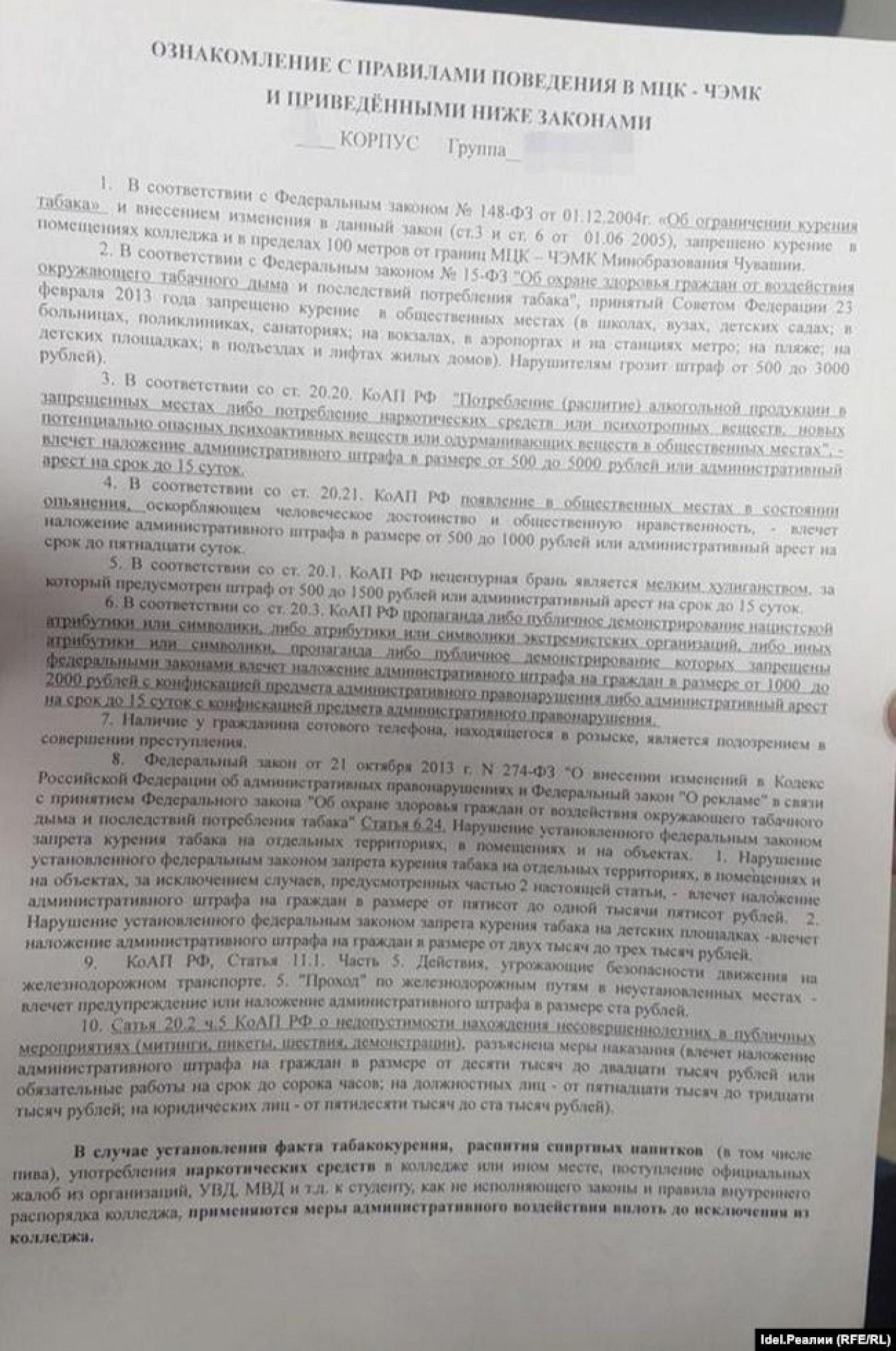 Студентов Чебоксарского электромеханического колледжа (ЧЭМК) заставляют подписать документ о внутренних правилах учебного заведения, который запрещает посещать митинги несовершеннолетним. Об этом пишет «Idel.Реалии» со ссылкой на документ, который изданию прислали учащиеся колледжа.