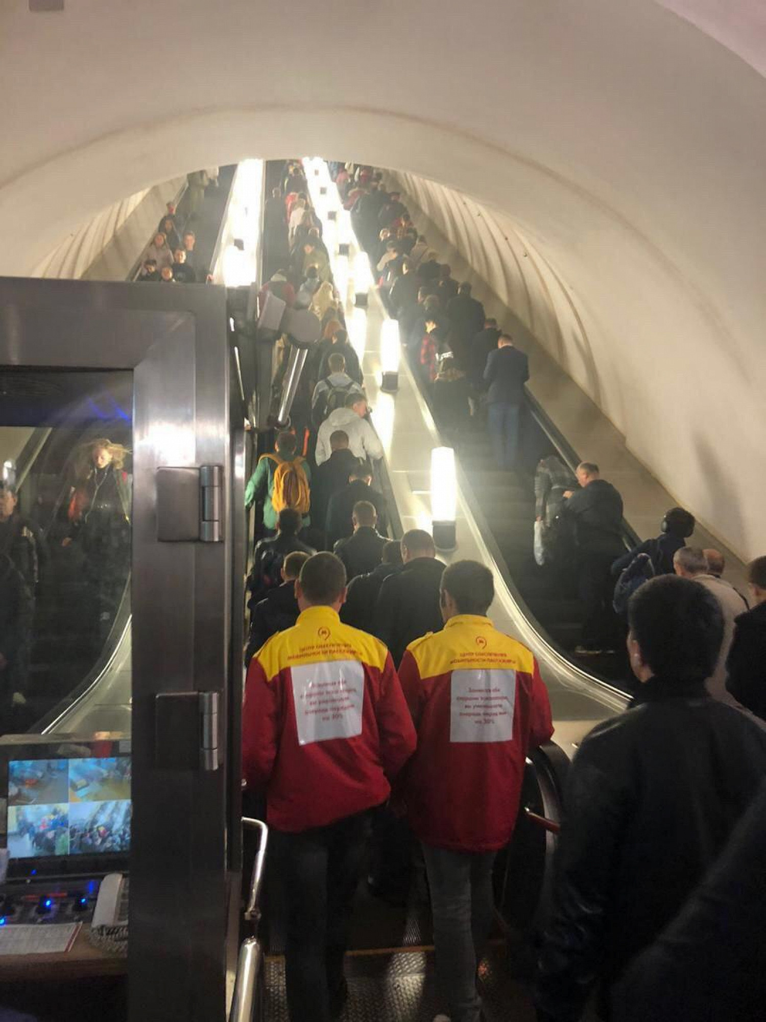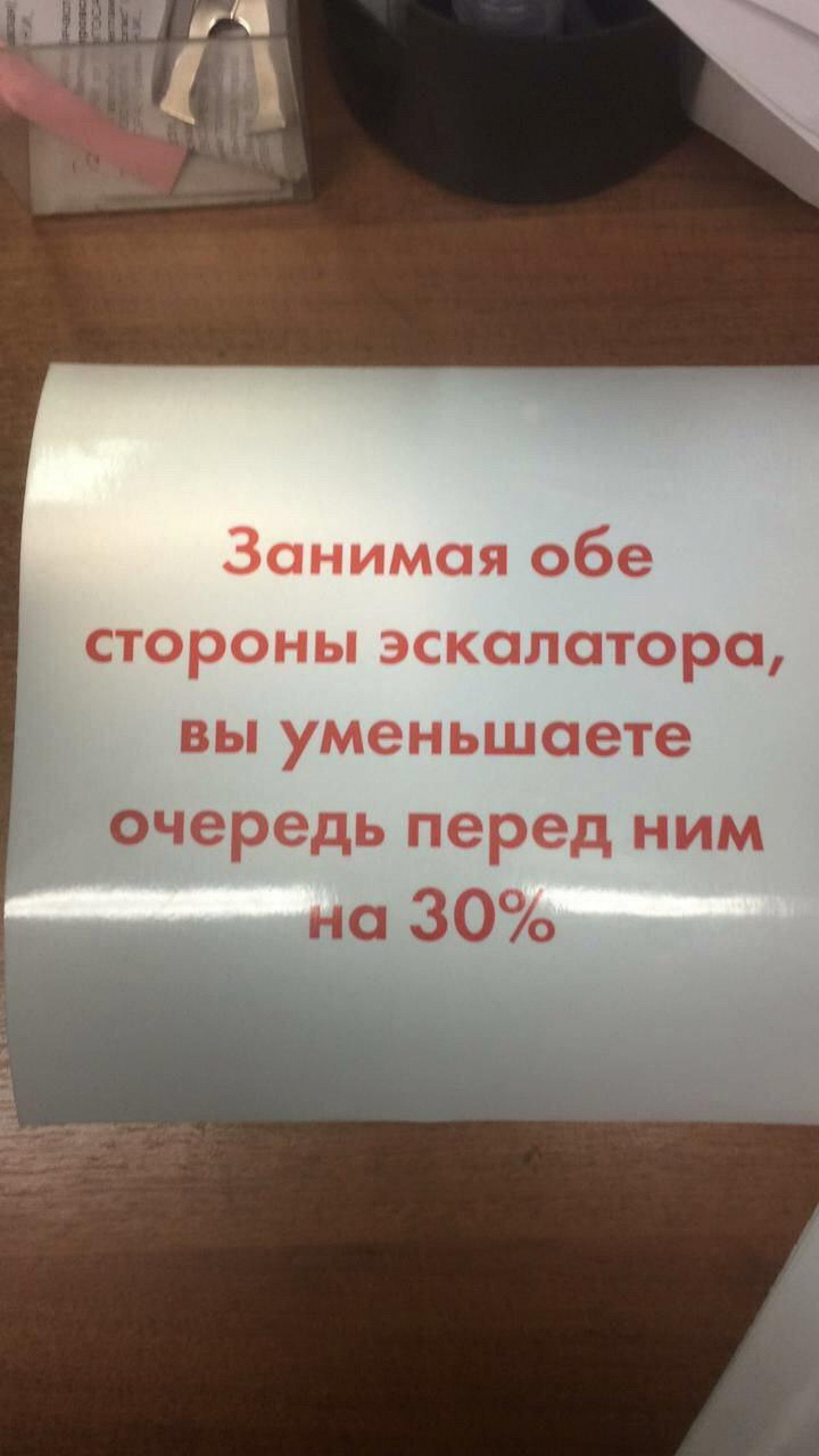 В период повышенного потока пассажиров специальные сотрудники занимают две стороны эскалатора, не давая свободно пройти по левой стороне. На спинах сотрудников написано: «Занимая обе стороны эскалатора, вы уменьшаете очередь перед ним на 30%».