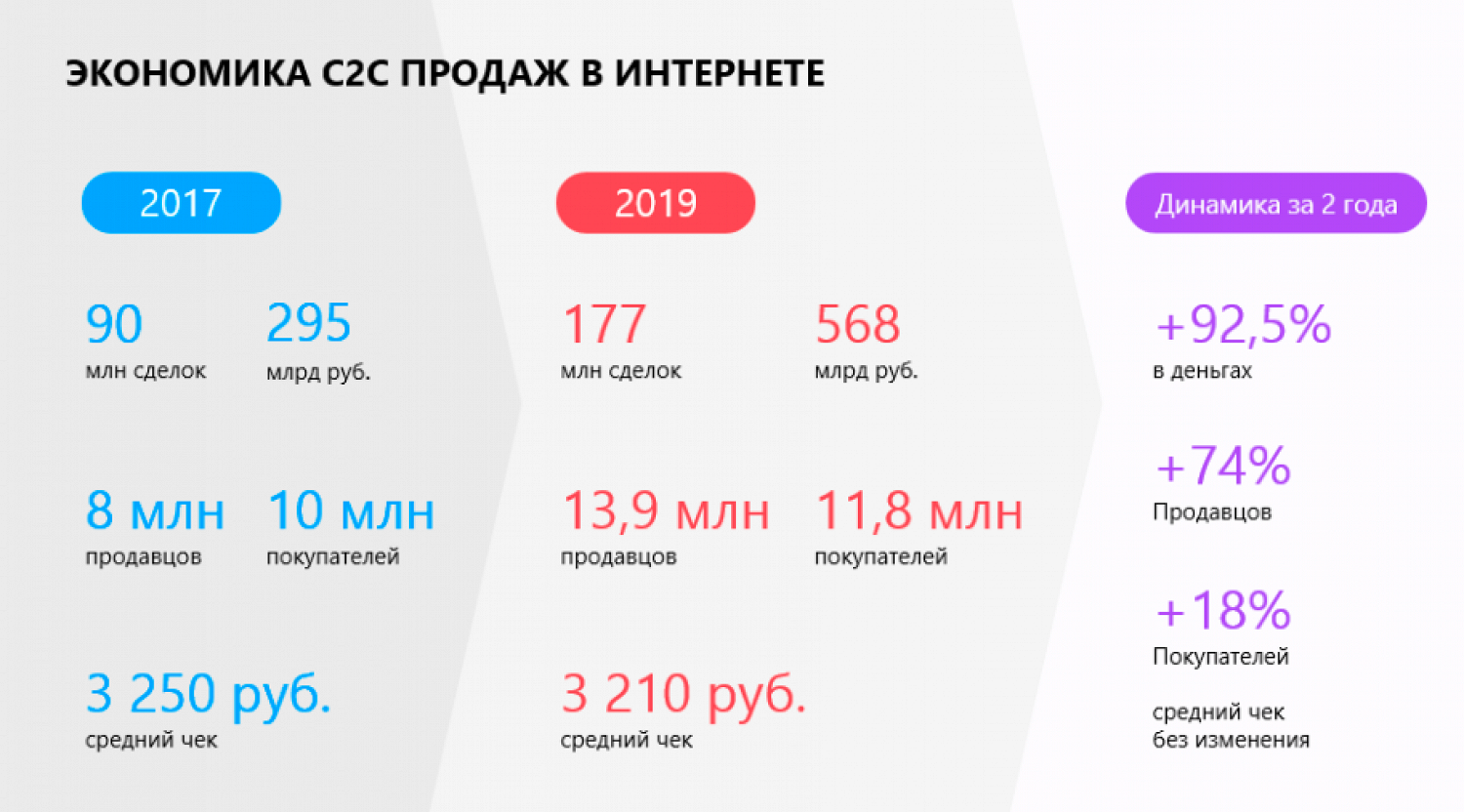 Рынок торговли между частными лицами (С2С, Consumer-to-consumer) в интернете в России за два года вырос почти в два раза — c 295 млрд рублей в 2017 году до 568 млрд рублей в 2019 году. Об этом говорится в совместном исследовании «Авито» и аналитиков Data Insight, с результатами которого ознакомилась «Афиша Daily».