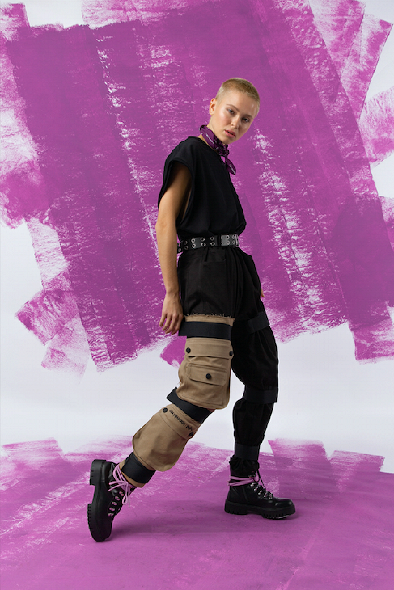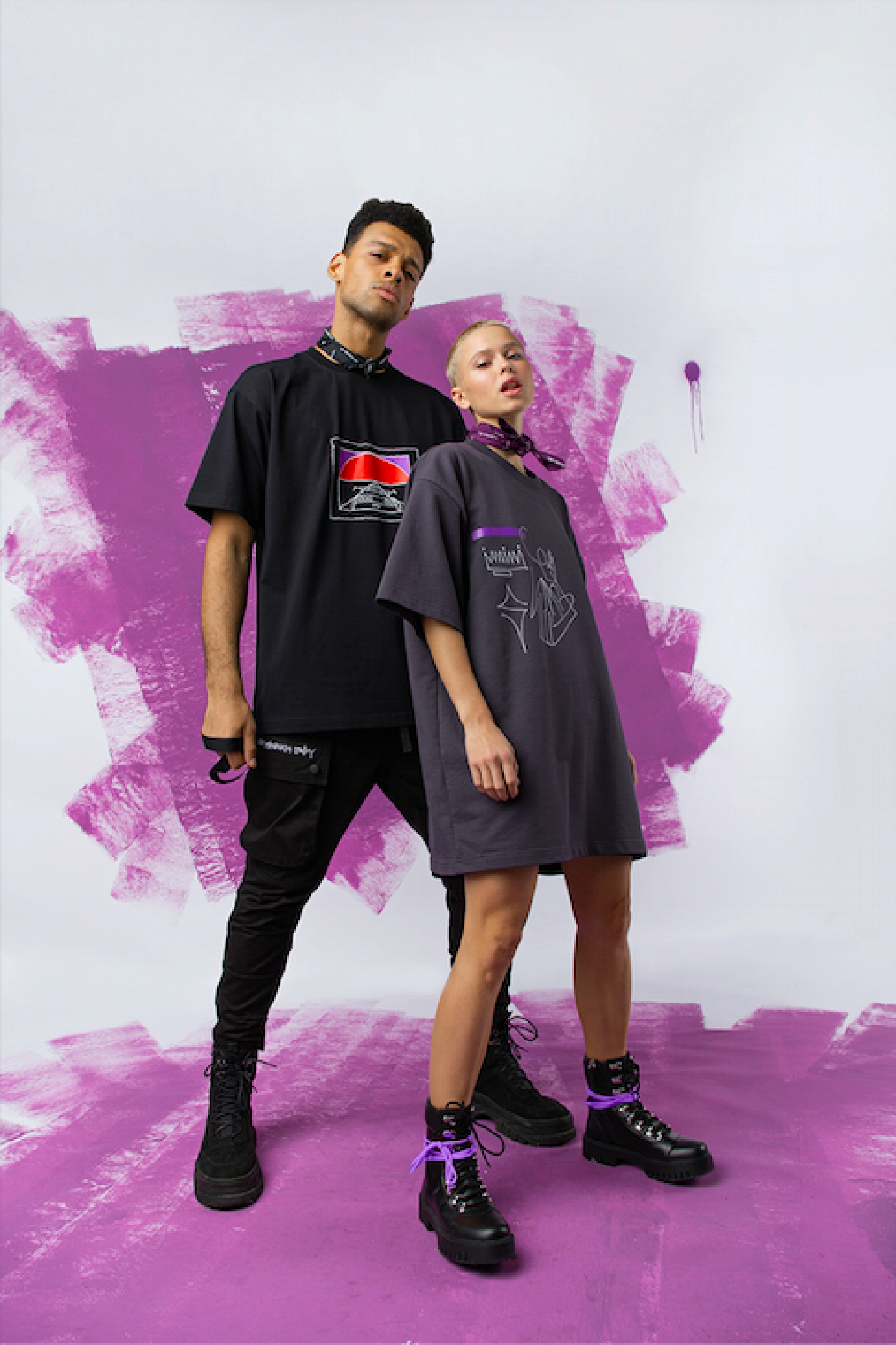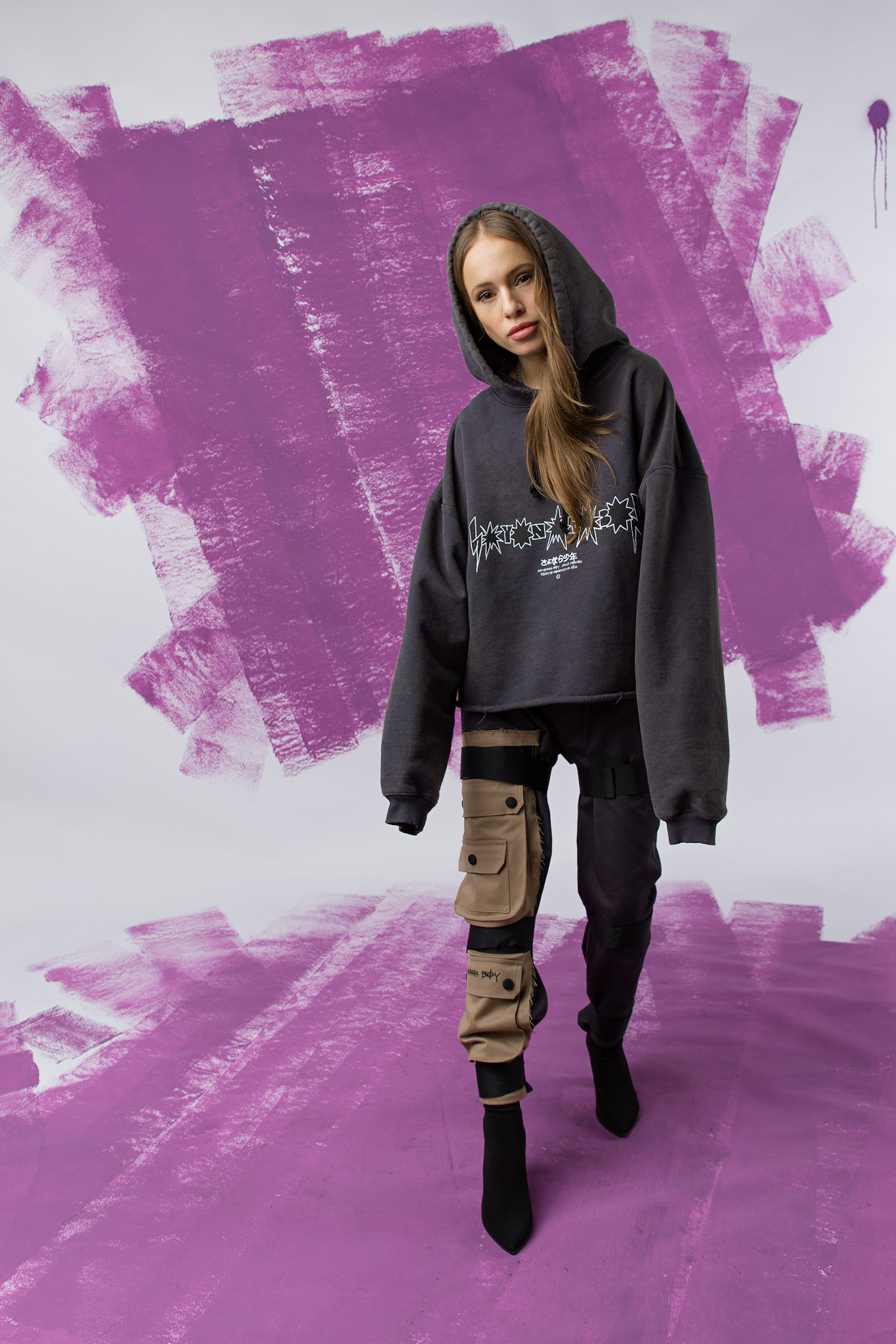 В линейке рубахи-кители из плотного хлопка, худи и свитшоты из футера, футболки из френч-терри, скинни из денима, брюки карго и чинос из плотного хлопка, пуховик с перекидной молнией, а также шапки и банданы. Главные цвета коллекции — фиолетовый, черный и графит. Все модели — оверсайз.