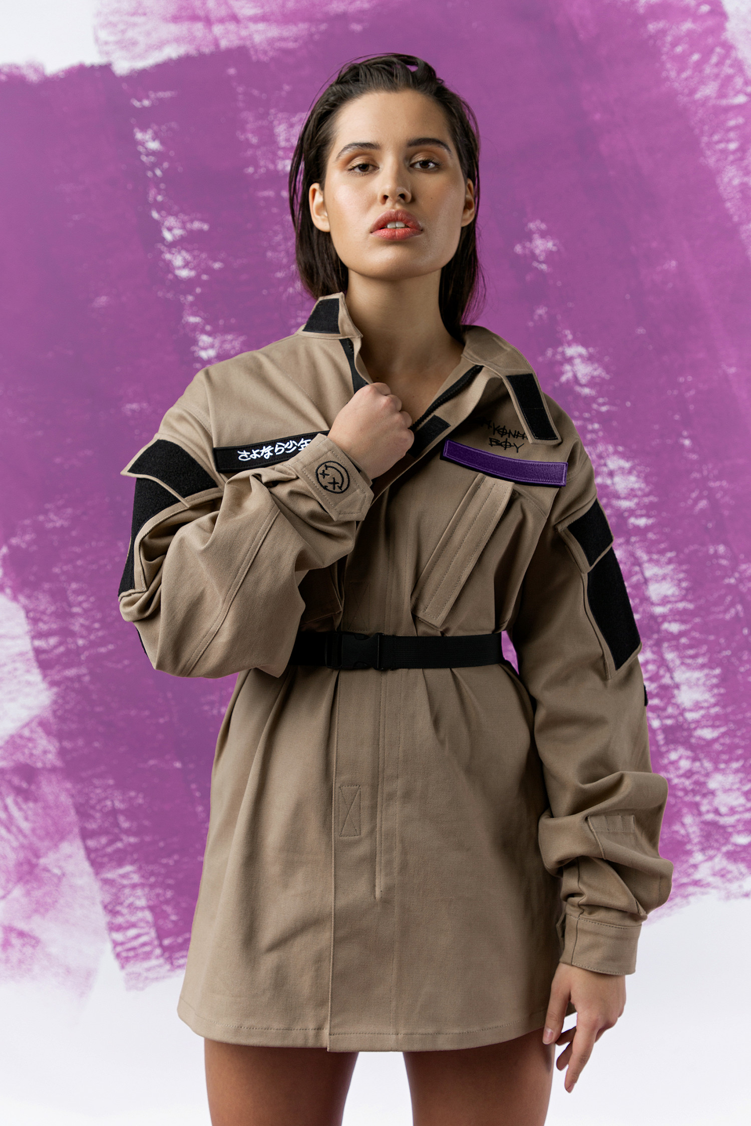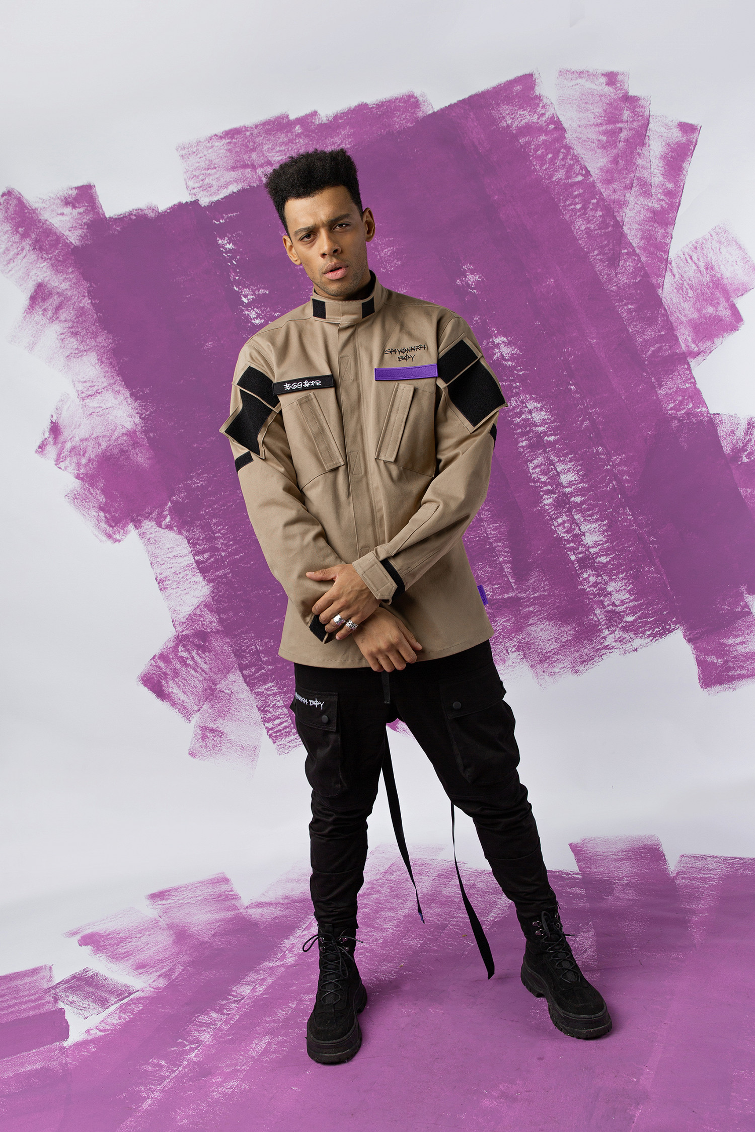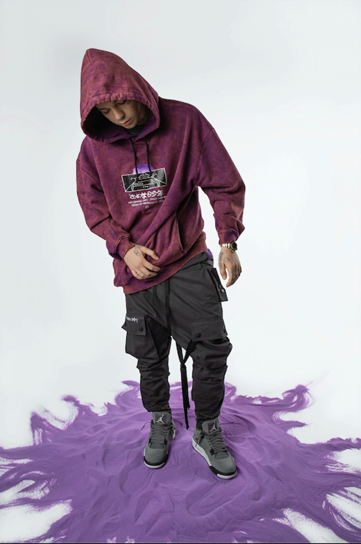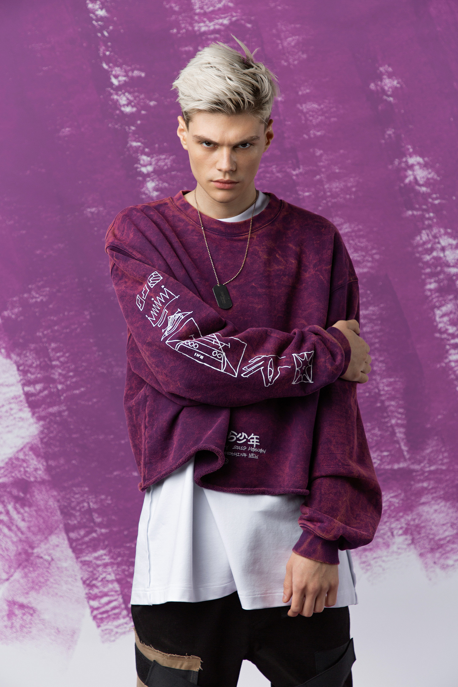 В линейке рубахи-кители из плотного хлопка, худи и свитшоты из футера, футболки из френч-терри, скинни из денима, брюки карго и чинос из плотного хлопка, пуховик с перекидной молнией, а также шапки и банданы. Главные цвета коллекции — фиолетовый, черный и графит. Все модели — оверсайз.