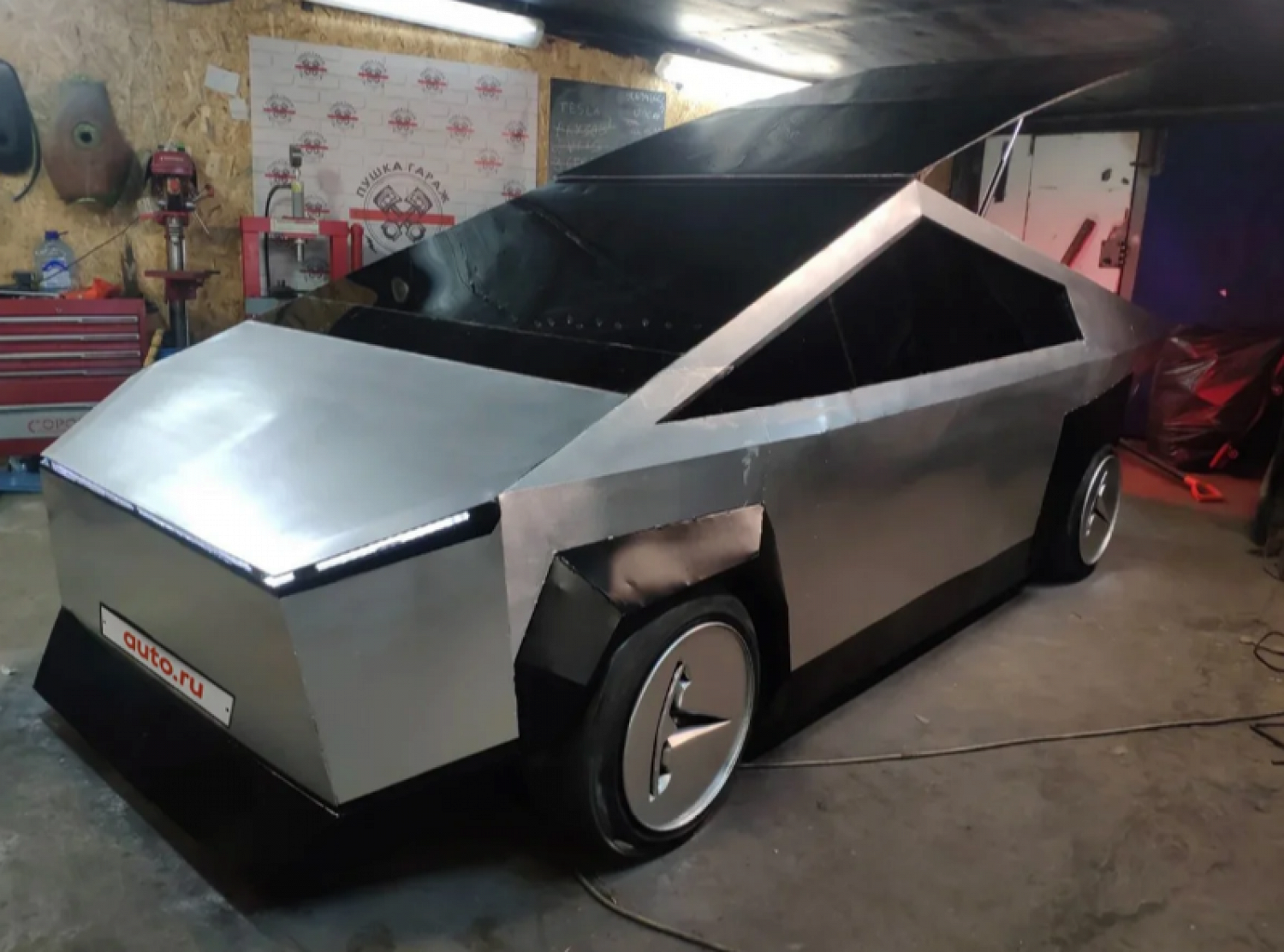 «Как тебе такое, Илон Маск? Первый и самый известный в России Cybertruck от команды ютьюб-канала «Пушка Гараж»! Машина, из‑за которой акции «Теслы» выросли до 420 долларов за штуку. Не бита, отлично покрашена.
