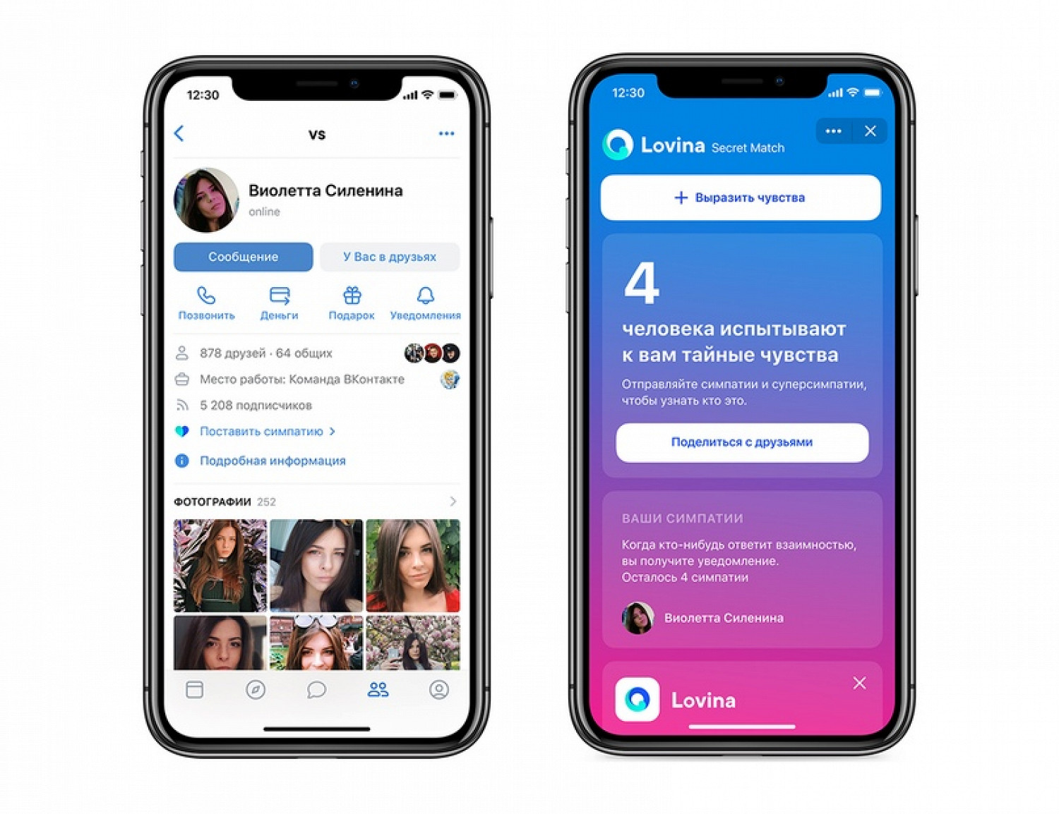На страницах пользователей появилась кнопка «Поставить симпатию». С помощью нее можно тайно признаться избраннику или избраннице в своих чувствах ― имена раскроются, если пользователи обменяются симпатиями. Количество отправленных и полученных симпатий можно посмотреть в мини-приложении «Тайные симпатии от Lovina».