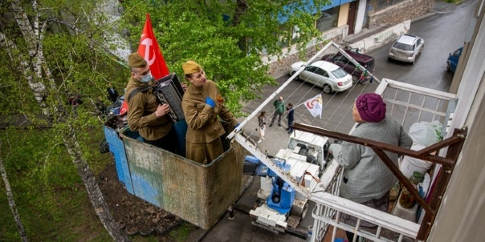 В Новосибирске местные волонтеры сыграли военные песни на баяне в кабине автовышки перед окнами ветеранов, сообщает издание NGS42.