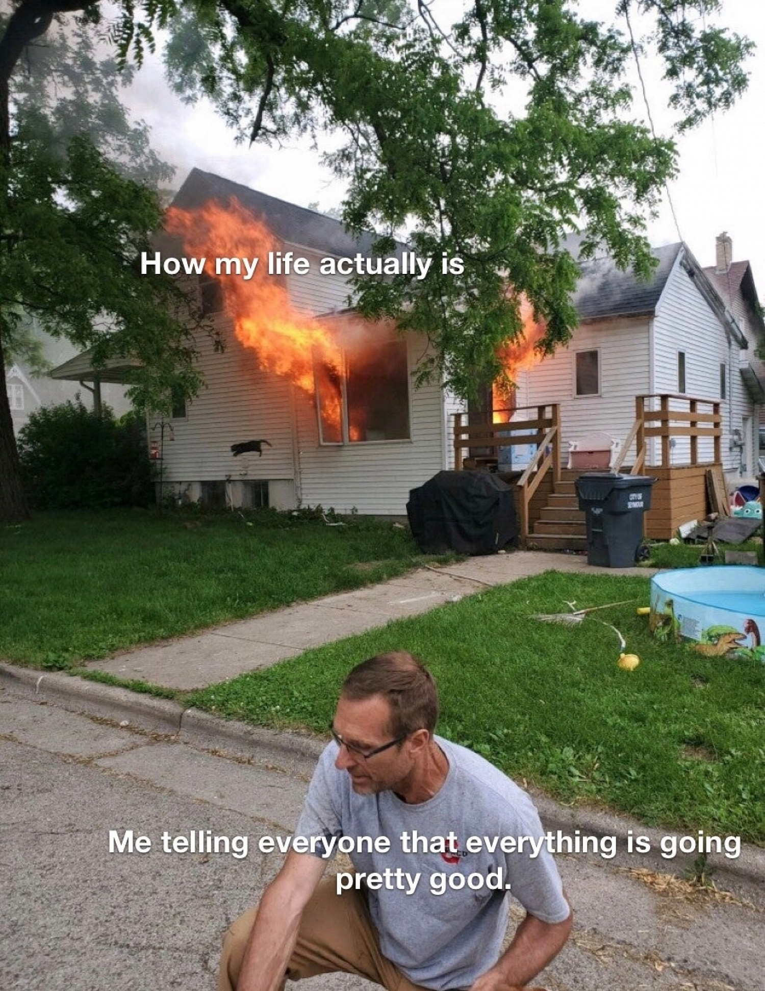 Владелец дома работал, а его жена и дети отправились купаться в пруду неподалеку. Дом загорелся, их сосед (именно он сидит на переднем плане фотографии) услышал звуки пожарной сигнализации, пришел на помощь и успел вывести собаку. Кота он не заметил, но тому и не понадобилась помощь. Позже кота нашли полицейские — он почти не пострадал, хотя у него немного обгорели шерсть и усы.