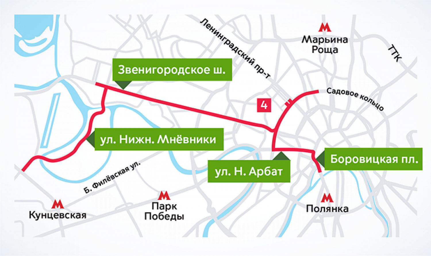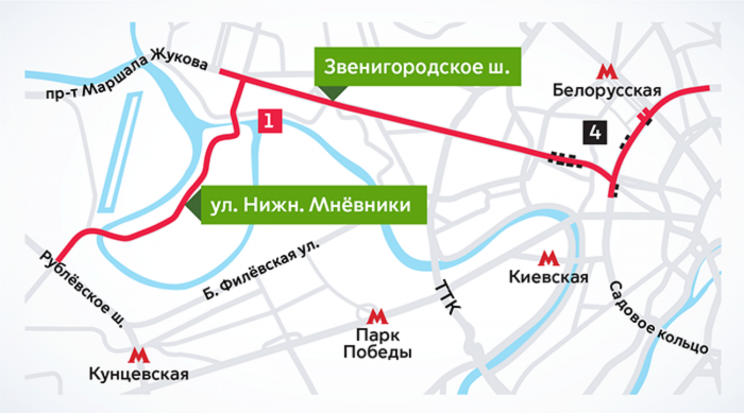 Большому Каменному мосту; Боровицкой площади; Моховой улице от Боровицкой площади до улицы Воздвиженки; улице Воздвиженке; улице Новый Арбат; Новинскому бульвару; Садовой-Кудринской улице; Большой Садовой улице; Садовой-Триумфальной улице; Садовой-Каретной улице; Баррикадной улице; улице Красная Пресня; Звенигородскому шоссе; улице Мневники; проспекту Маршала Жукова от улицы Генерала Карбышева до улицы Народного Ополчения; Крылатской улице от Рублевского шоссе до улицы Нижние Мневники в сторону улицы Мневники; улице Нижние Мневники от Крылатской улицы до Карамышевского моста в сторону улицы Мневники; Карамышевскому мосту в сторону улицы Мневники; улице Народного Ополчения от Карамышевской набережной до улицы Мневники в сторону улицы Мневники.