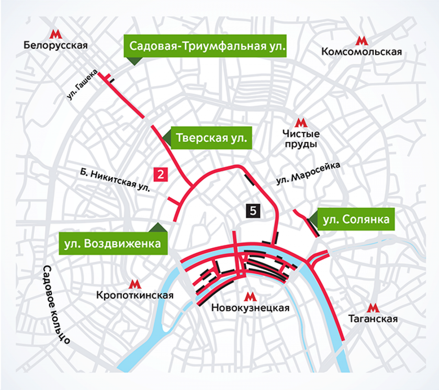 Тверскую улицу от Моховой улицы до Тверского бульвара и от Большой Бронной до Большой Садовой улицы; 1-ю Тверскую-Ямскую улицу от Большой Садовой до улицы Гашека; Оружейный переулок от дома 3, строения 1, до Тверской улицы; Моховую улицу от Воздвиженки до Тверской улицы; улицу Охотный Ряд; Большую Никитскую улицу от Моховой улицы до Романова переулка; Новую площадь; Старую площадь; Китайгородский проезд; Москворецкую набережную; Кремлевскую набережную; Гончарную набережную от Гончарного проезда; Котельническую набережную; Устьинскую набережную; Подгорскую набережную; Большой Москворецкий мост; Малый Москворецкий мост; Чугунный мост; Болотную улицу; Болотную площадь; Софийскую набережную; Раушскую набережную; Болотную набережную; Фалеевский переулок; улицу Балчуг; Лубочный переулок; Садовническую набережную от улицы Балчуг до Большого Устьинского моста; Садовническую улицу от улицы Балчуг до Большого Устьинского моста; 1-й Раушский переулок; 2-й Раушский переулок; улицу Солянку; Кадашевскую набережную.