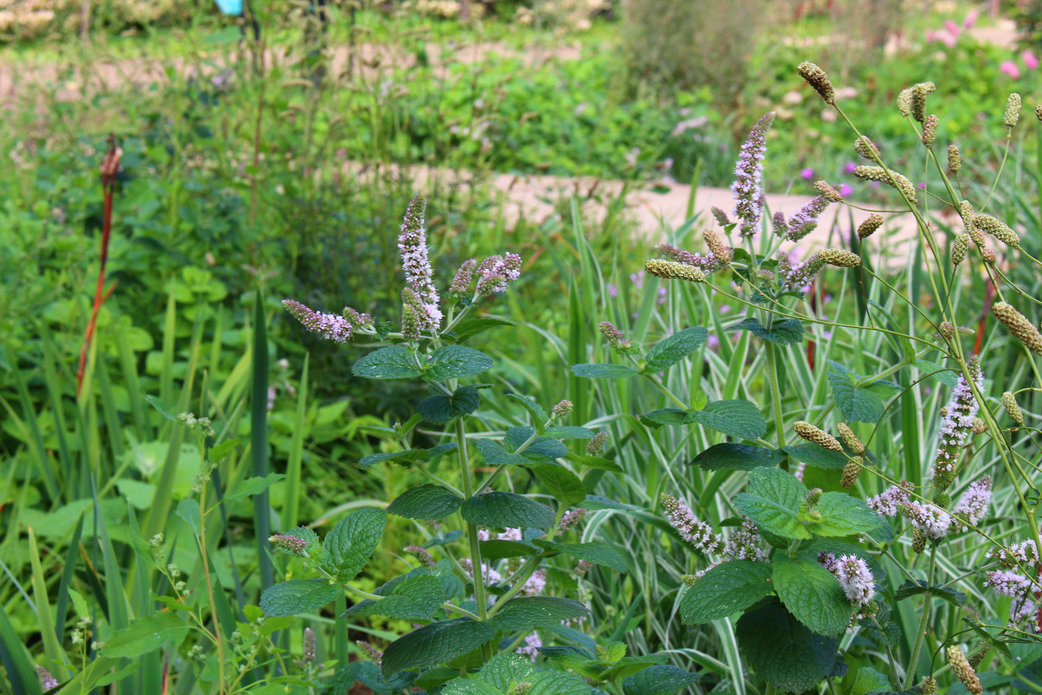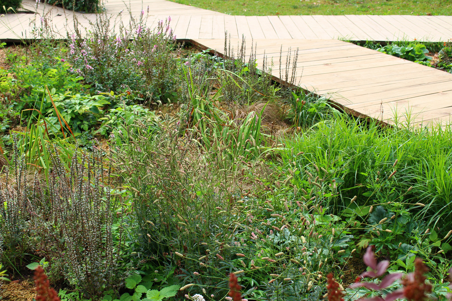 Все поверхности сада впитывают воду, а среди растений, в нем представленных, — осоки, ирисы, василистники, горцы, лабазники, посконники, дербенники, а также некоторые кустарники и небольшие деревья, например, карликовая береза и пурпурная ива. Всего — более 40 видов растений.