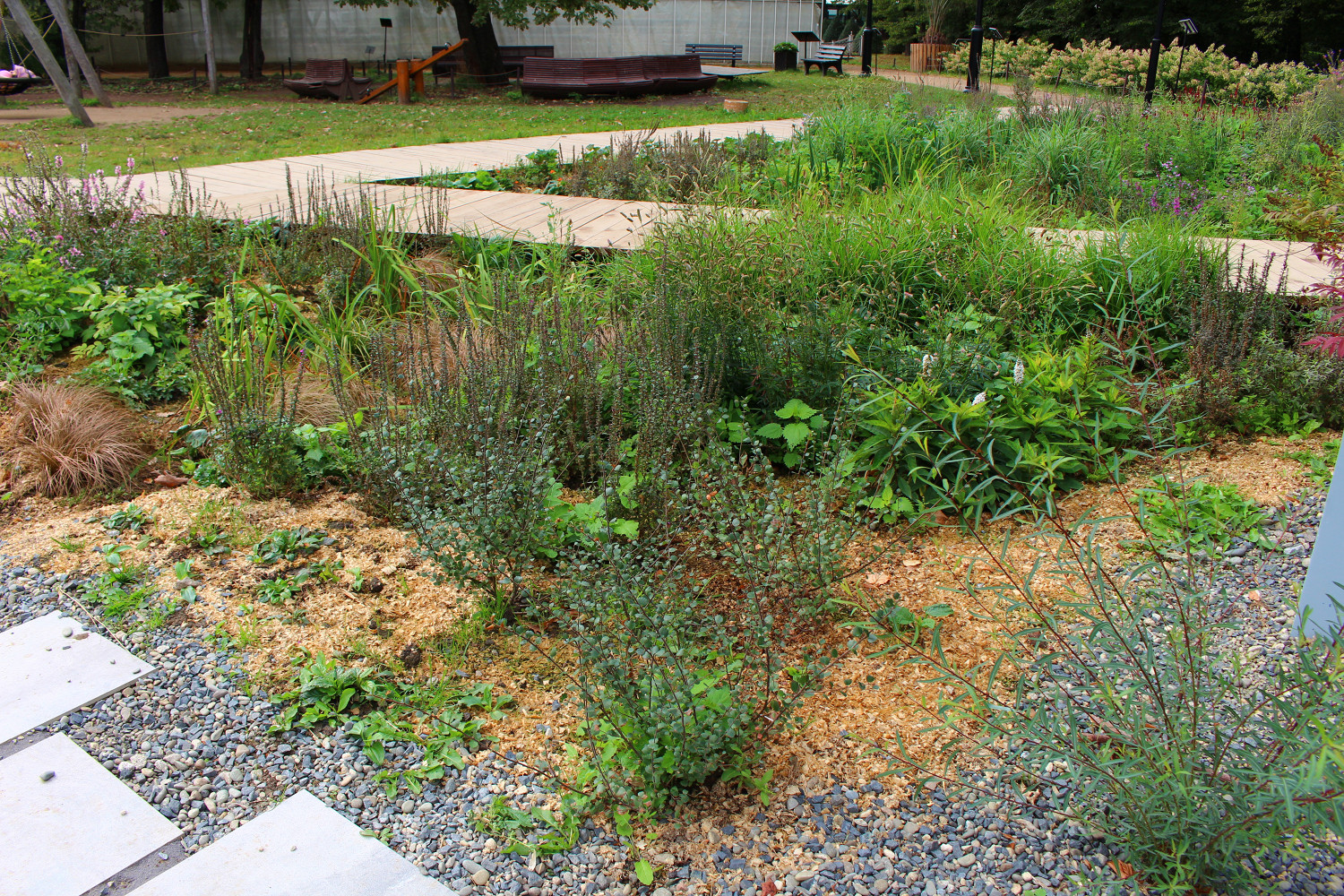 «Ранее ошибочно считалось, что от выпавших в городе осадков нужно как можно быстрее избавляться: для этого задействовали коллекторы, дождеприемники. Однако <…> вода не пополняет грунтовые воды, что плохо для растений. <…> В итоге возникла противоположная парадигма: сейчас во всем мире считается, что дождевую воду необходимо как можно дольше задерживать в том месте, где она выпала. Какие есть способы? Во-первых, озеленение кровель», — рассказал ландшафтный архитектор «Аптекарского огорода» Артем Паршин.