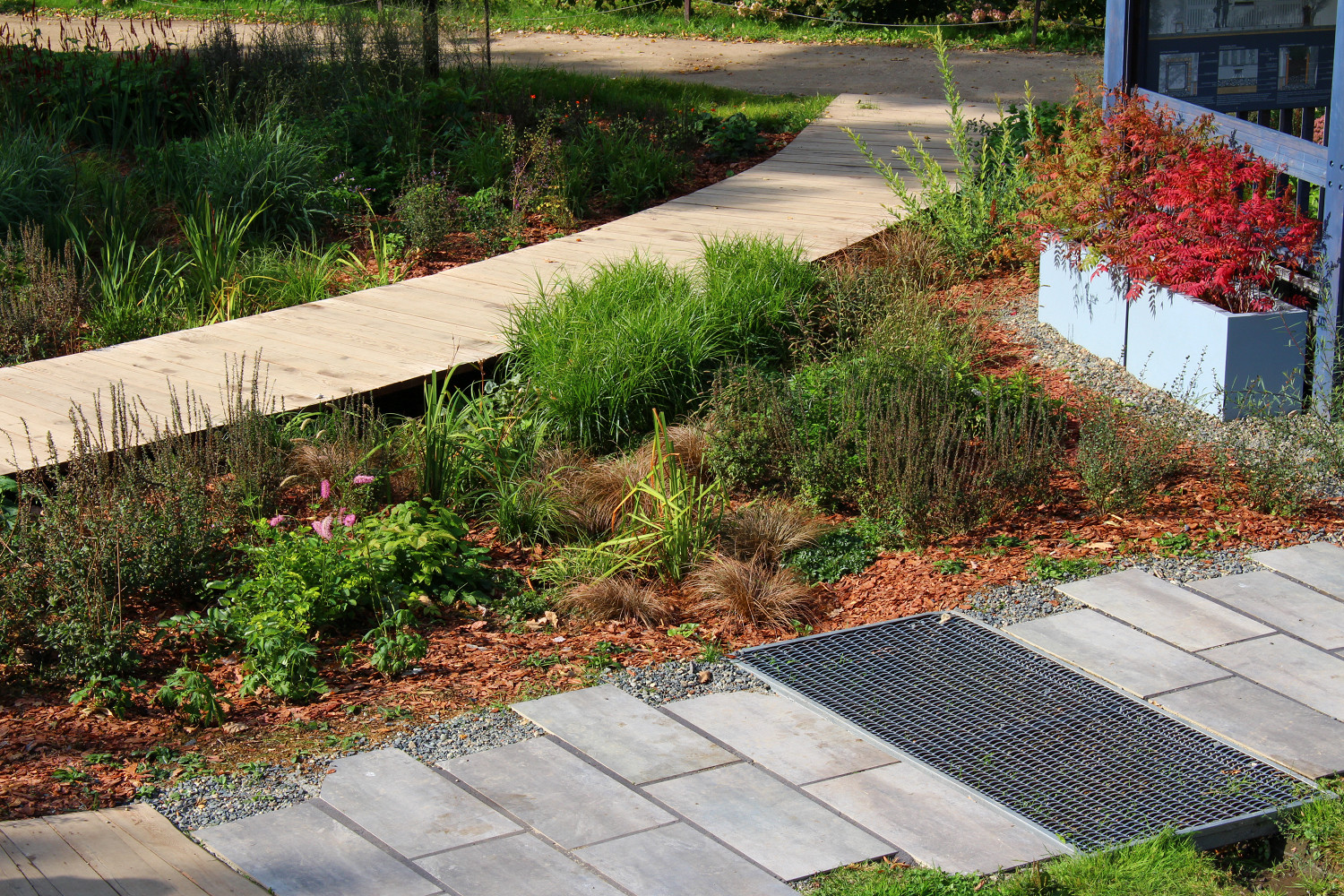 «Сад дождя» призван рассказать о роли дождевой воды в городе. В состав проекта входят павильон-беседка с озелененной кровлей, водопроницаемое мощение на дренирующем основании и водоудерживающий сад-биотоп, засаженный влаголюбивыми растениями.