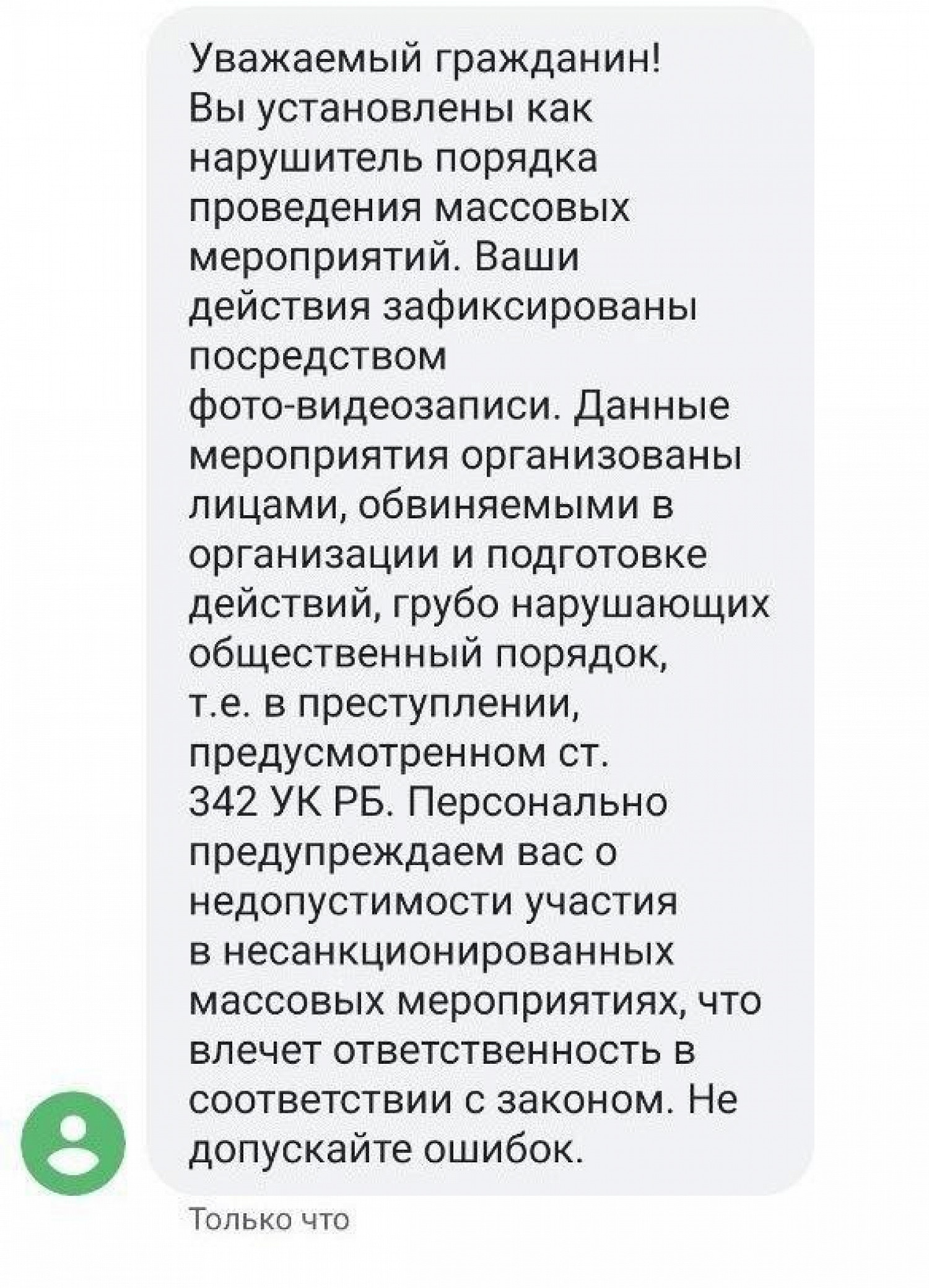 Отправитель предупреждает об ответственности перед законом. Сообщение заканчивается словами «Не допускайте ошибок».