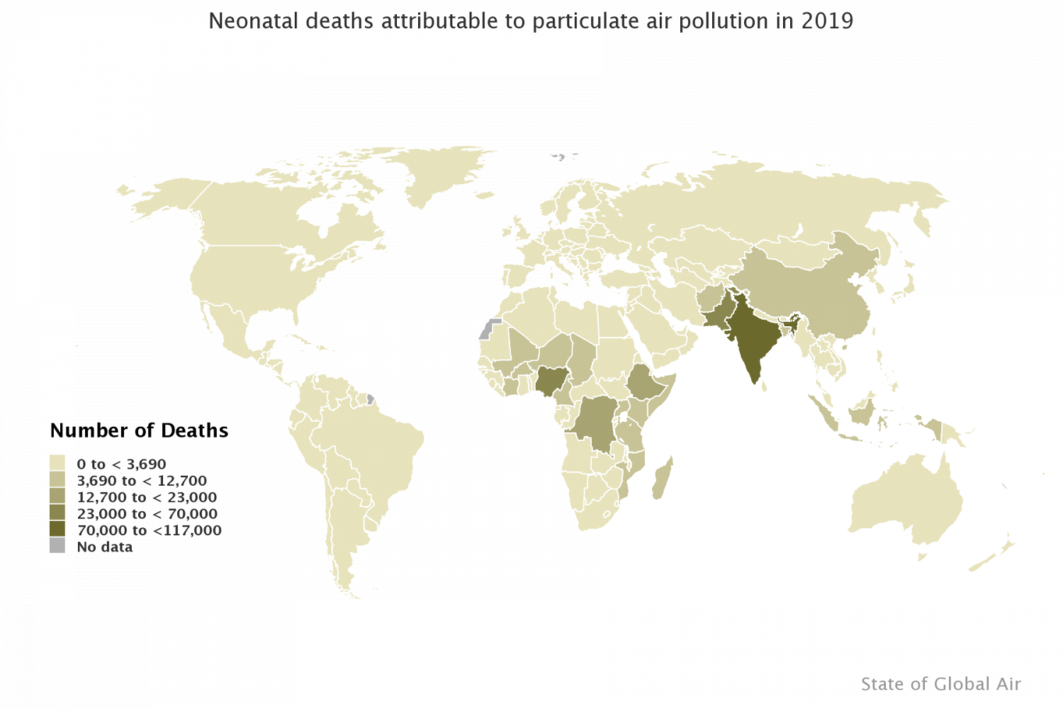 Самое высокая смертность младенцев, связанная с загрязнением воздуха, — в странах, где используется твердое топливо (например, уголь или дрова). В Африке, к югу от Сахары, около 80% из почти 236 тыс. младенческих смертей в первый месяц жизни связаны с загрязнением воздуха в домашних условиях. В Южной Азии другие цифры: 50% из 186 тыс.