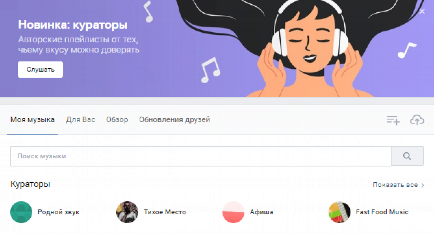 Среди первых кураторов — сообщества «Рифмы и панчи», «Другая музыка», «Родной звук», а также группы Московской филармонии и Мариинского театра. У «Афиши» тоже есть музыкальное сообщество, которое курирует редактор Николай Овчинников. Его подборки вместе с остальными будут отображаться в музыкальном разделе, если на них подписаться на странице куратора.
