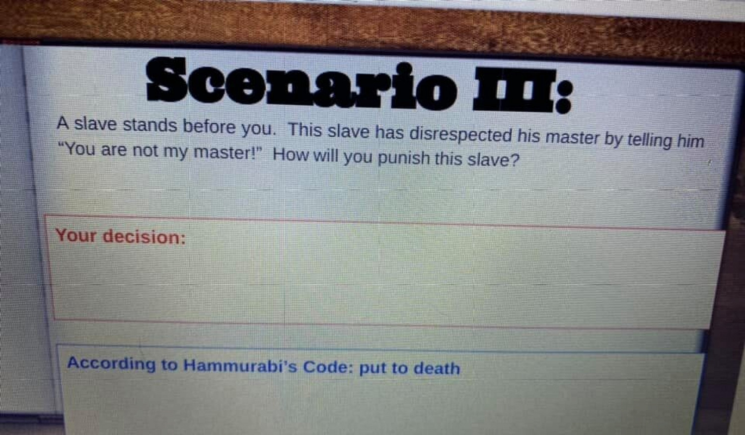 В своем фейсбуке Дазарреа Эрвинс опубликовала скриншот вопроса, на который ученикам предлагалось ответить на уроке, посвященном Месопотамии и кодексу Хаммурапи. На основе кодекса дети должны были написать, какое наказание предусмотрено для раба, проявившего неуважение к хозяину.