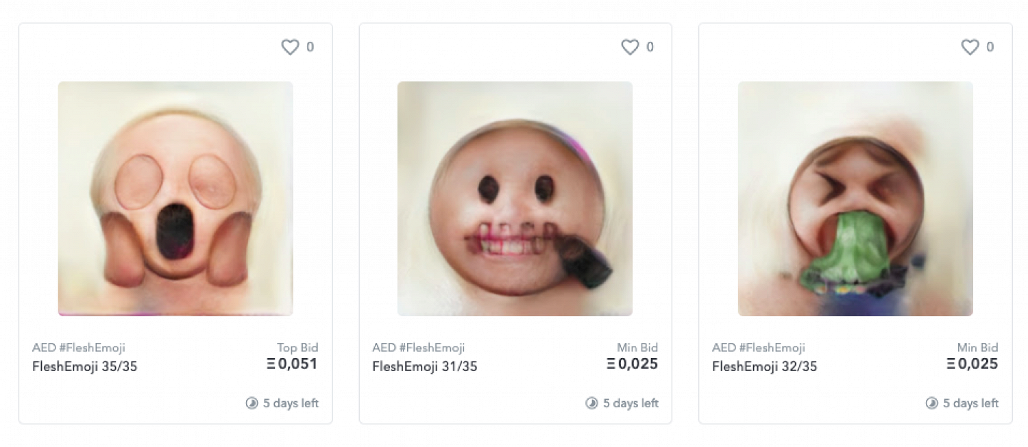 Получившиеся творения художники выставили на аукцион в виде невзаимозаменяемых токенов (NFT). Стартовая цена каждого лота составляет где‑то 0,04 единицы криптовалюты Ethereum (около 77 долларов).