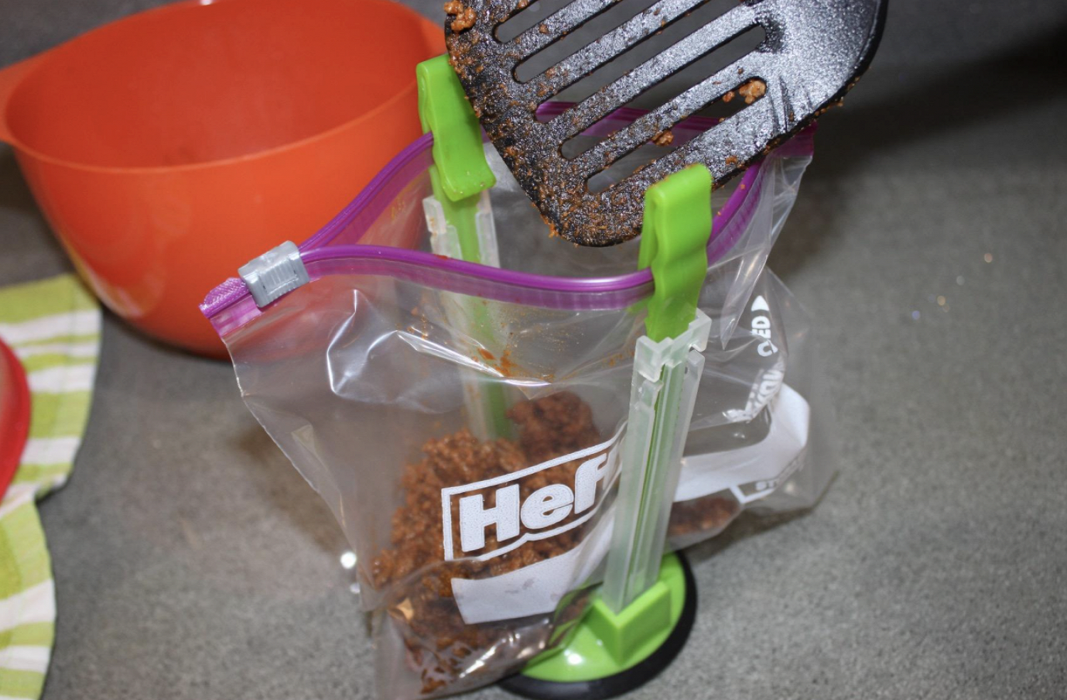 Для тех, кто хранит еду в специальных пакетах, создали держатель, помогающий с комфортом складывать овощи, фрукты и жидкую пищу. Устройство можно регулировать по высоте и ширине, так что оставить себе на завтра можно любое количество лакомств.