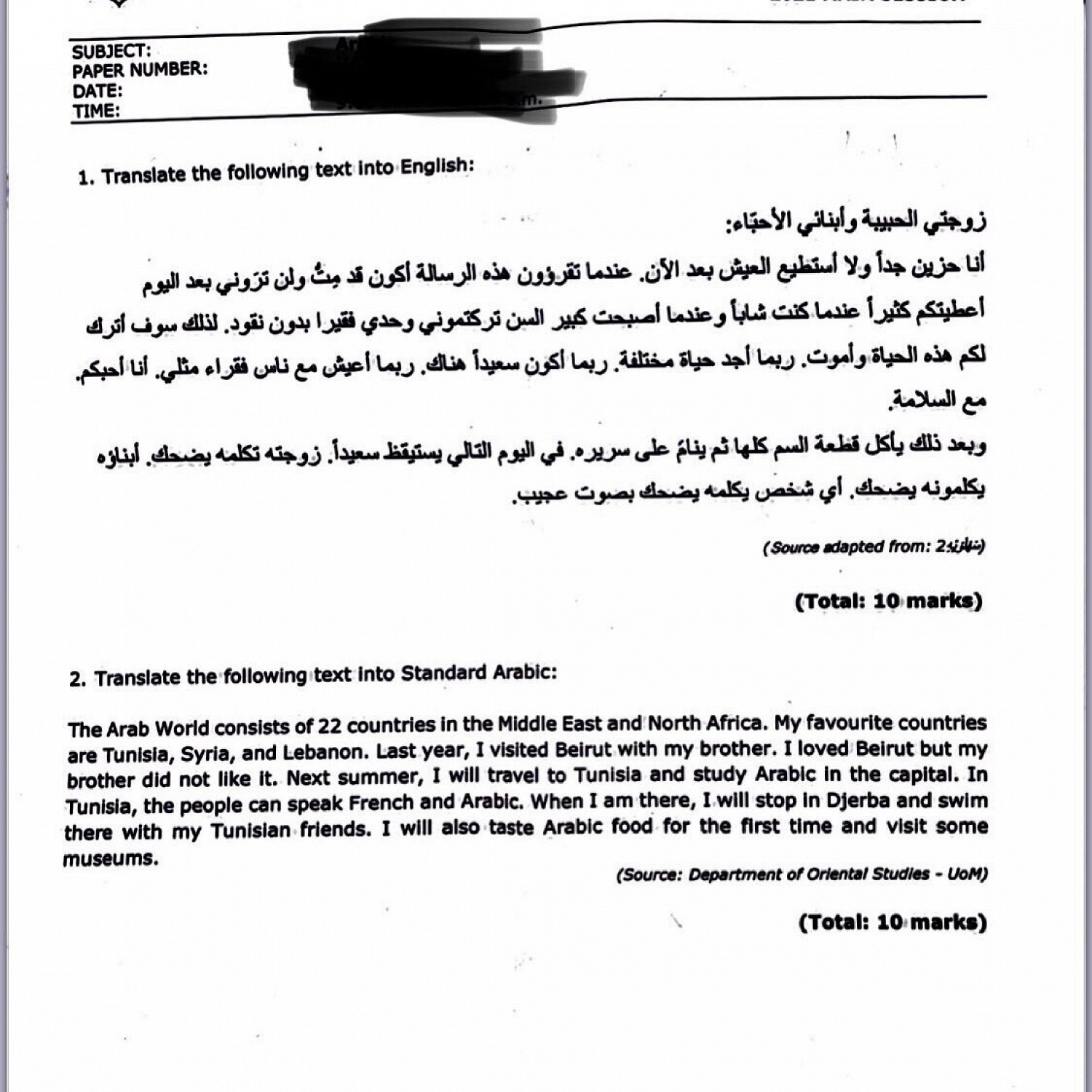 Подросткам 15 и 16 лет, сдающим школьный экзамен по арабскому языку для поступления в Мальтийский университет, дали перевести на английский язык предсмертную записку. В ней мужчина пишет жене и детям, что собирается совершить суицид. Об этом передает Times of Malta.