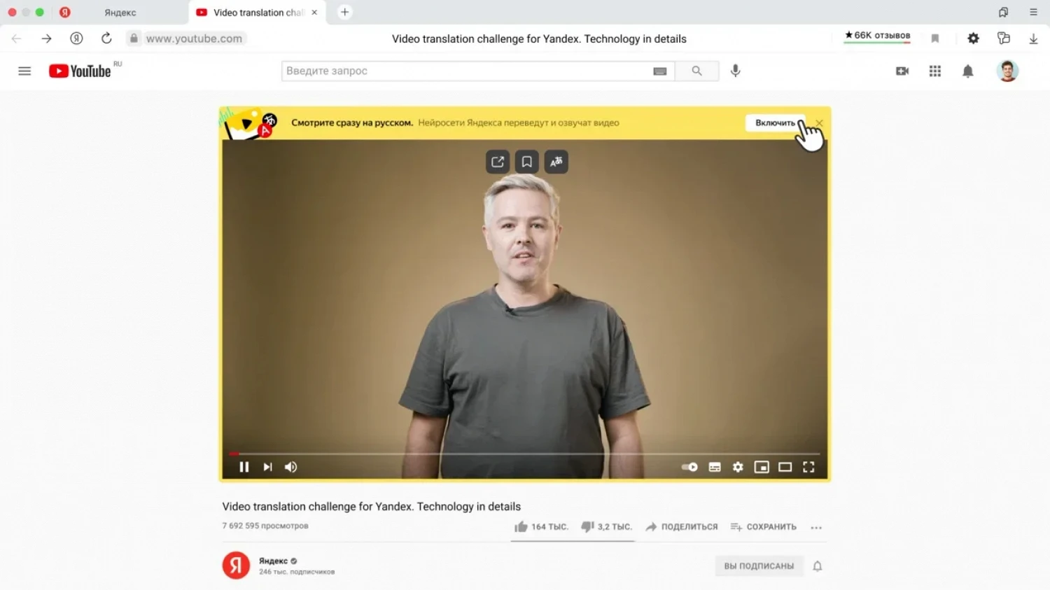 В нем есть видео про изменение климата, машинное обучение, историю Плутона и другие. Функция машинного перевода доступна только в десктопной версии «Яндекс.Браузера». Чтобы воспользоваться ею, необходимо включить автоматическую озвучку в желтом всплывающем окне вверху экрана.